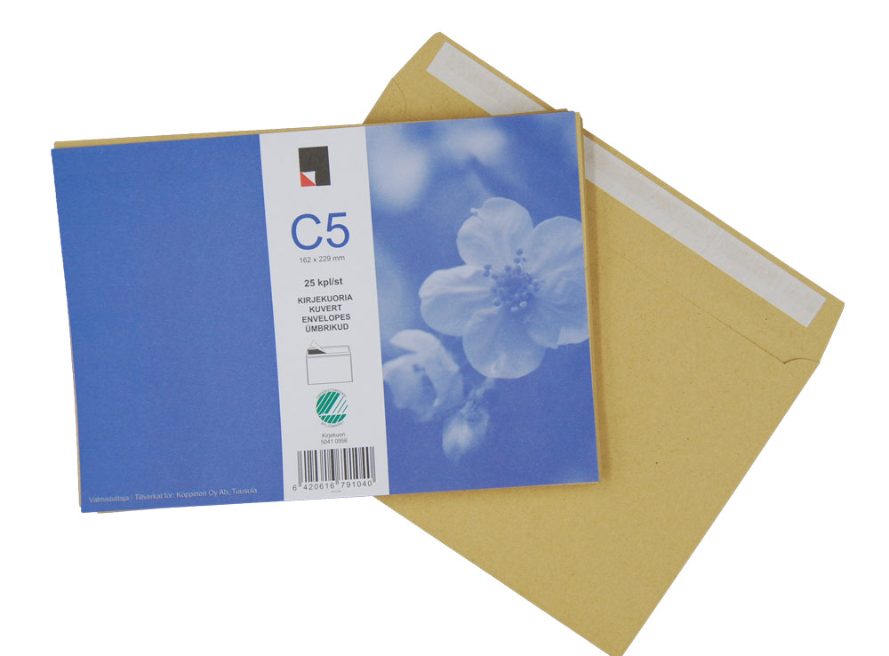 Ruskea kirjekuori C5, 25kpl. Sulkemiseen teippireuna. Kirjekuoressa Ympäristömerkki.