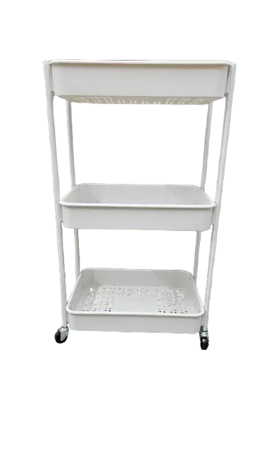 Korivaunu , jossakolme tasoa.Materiaali muovil teräs, pyörätterästä.VALKOINEN. Vaununkoko 40x29x75CM