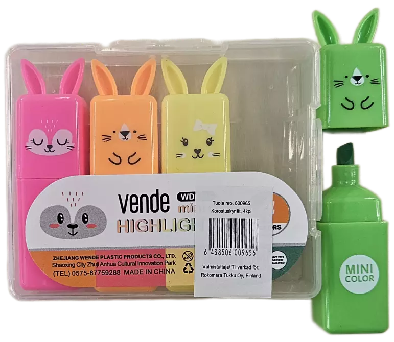 Pakkaus sisältää 4 kompaktin kokoista korostuskynää kätevässä säilytyslaatikkossa. Sopii oppikirjojen, muistiinpanojen ja muiden tärkeiden tekstien merkitsemiseen.
