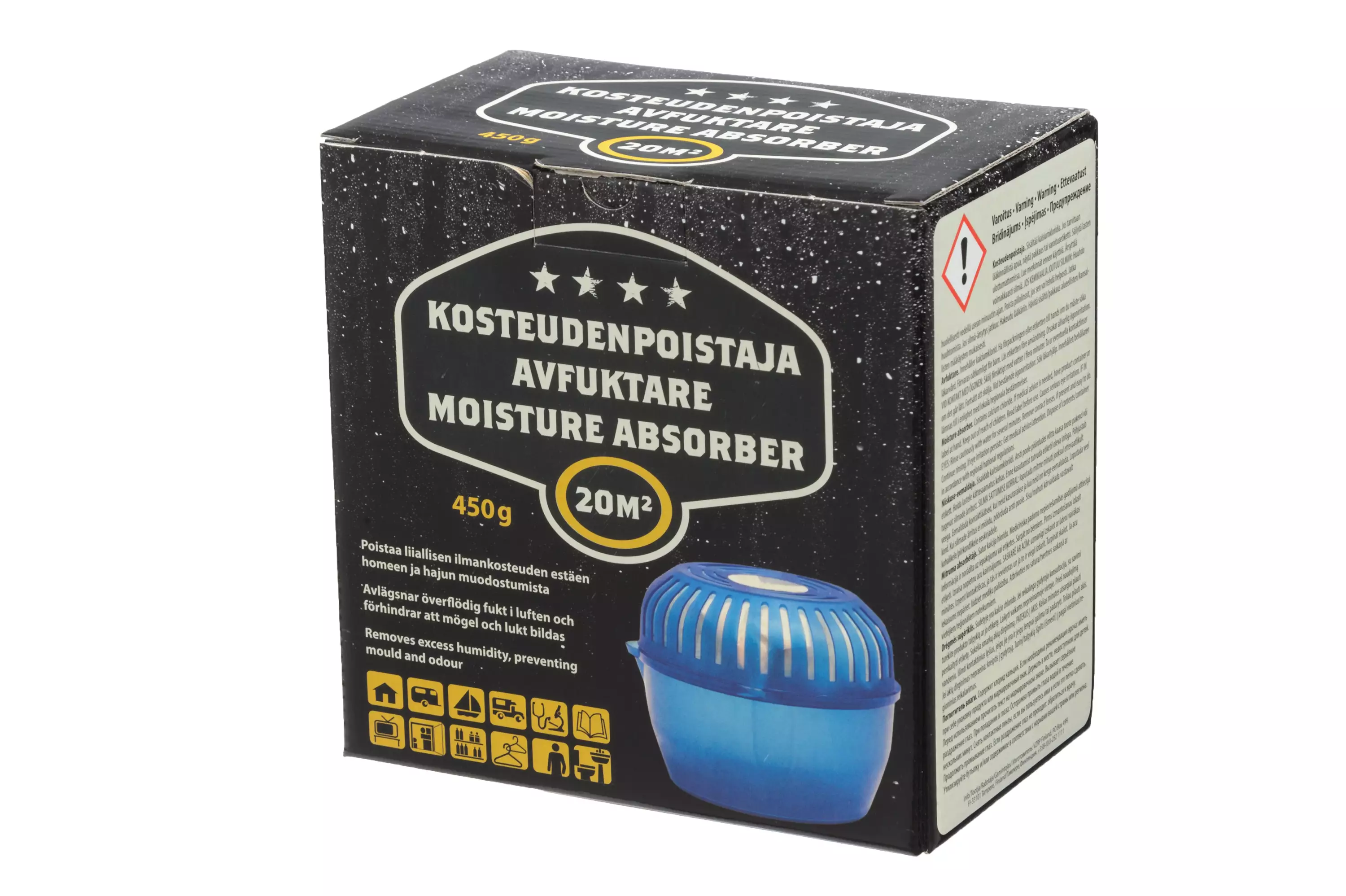 Poistaa liiallisen ilmankosteuden estäen homeen ja hajun muodostumista. Kosteudenpoistajaa voidaan käyttää vuoden ympäri ja kaikissa olosuhteissa ja lämpötiloissa. Tarvittaessa se tasaa kosteuden sitomalla ylimääräisen ilmankosteuden itseensä. Mikäli ilman kosteuspitoisuus on alhainen, suolakiteet ovat lepotilassa. Mitä suurempi ilmankosteus on, sitä enemmän kosteutta imeytyy kiteisiin. Tämä ominaisuus tekee kosteudenpoistajasta erittäin tehokkaan avun hometta, tunkkaista hajua ja ruostumista vastaan. Yksi täyttöpussi riittää 1 - 3 kuukauden käyttöön kosteuden määrästä ja lämpötilasta riippuen. Mukana yksi täyttöpussi.