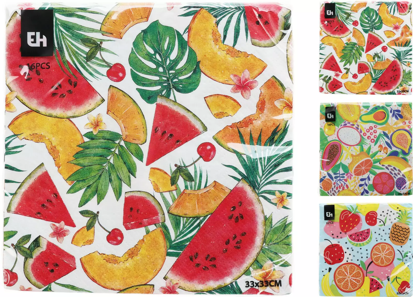 Raikkaat ja värikkäät hedelmäkuosiset servetit tuovat iloa kattaukseen arjessa ja juhlassa. Kolmikerroksinen rakenne takaa hyvän imukyvyn ja kestävyyden, ja FSC-sertifioitu materiaali tekee valinnasta vastuullisemman.