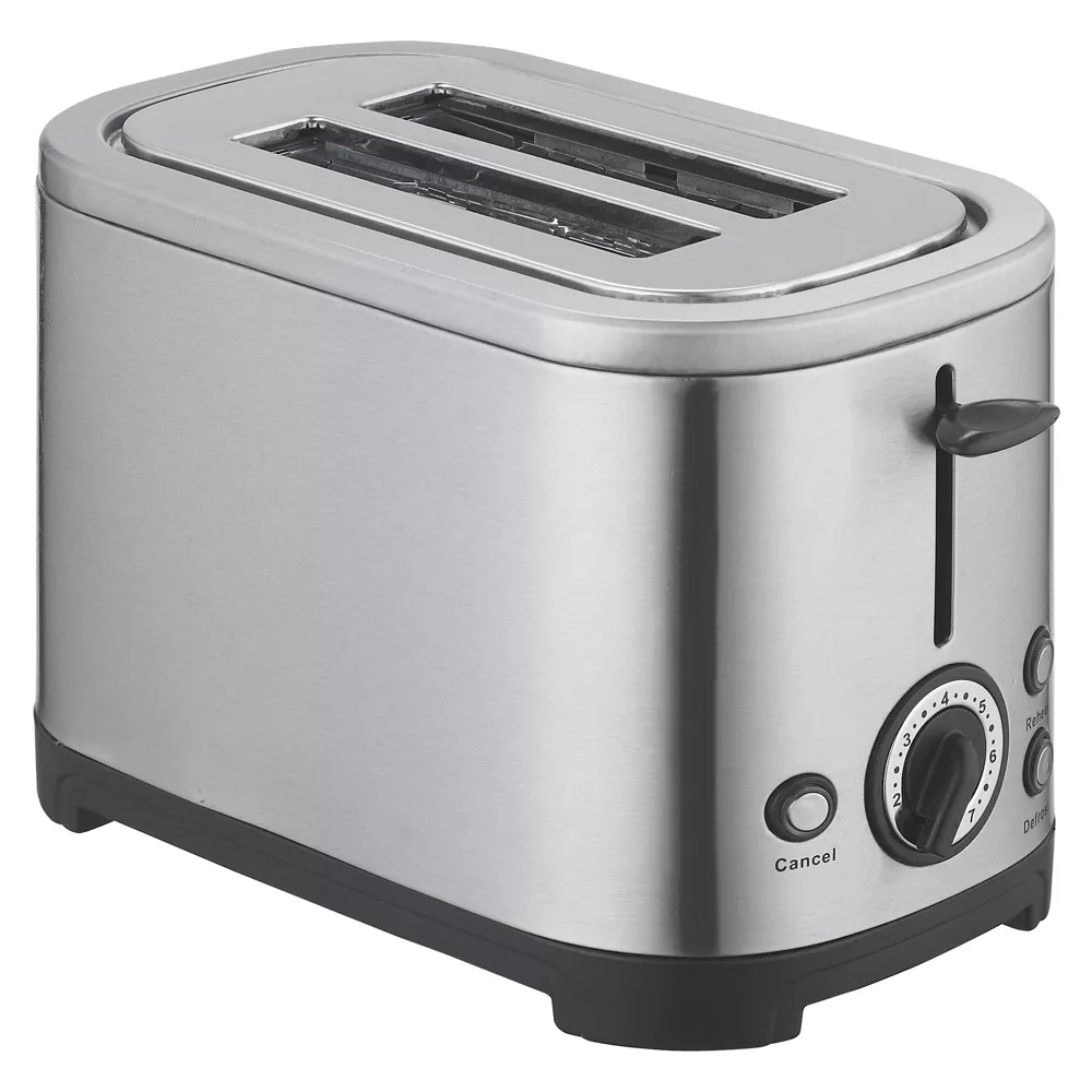 Tyylikäs teräksinen 2-leivän paahdin. Pysäytyspainike, sulautuspainike, uudelleen paahtamispainike, säädettävä paahdinaste, murukotelo, teho 700W.