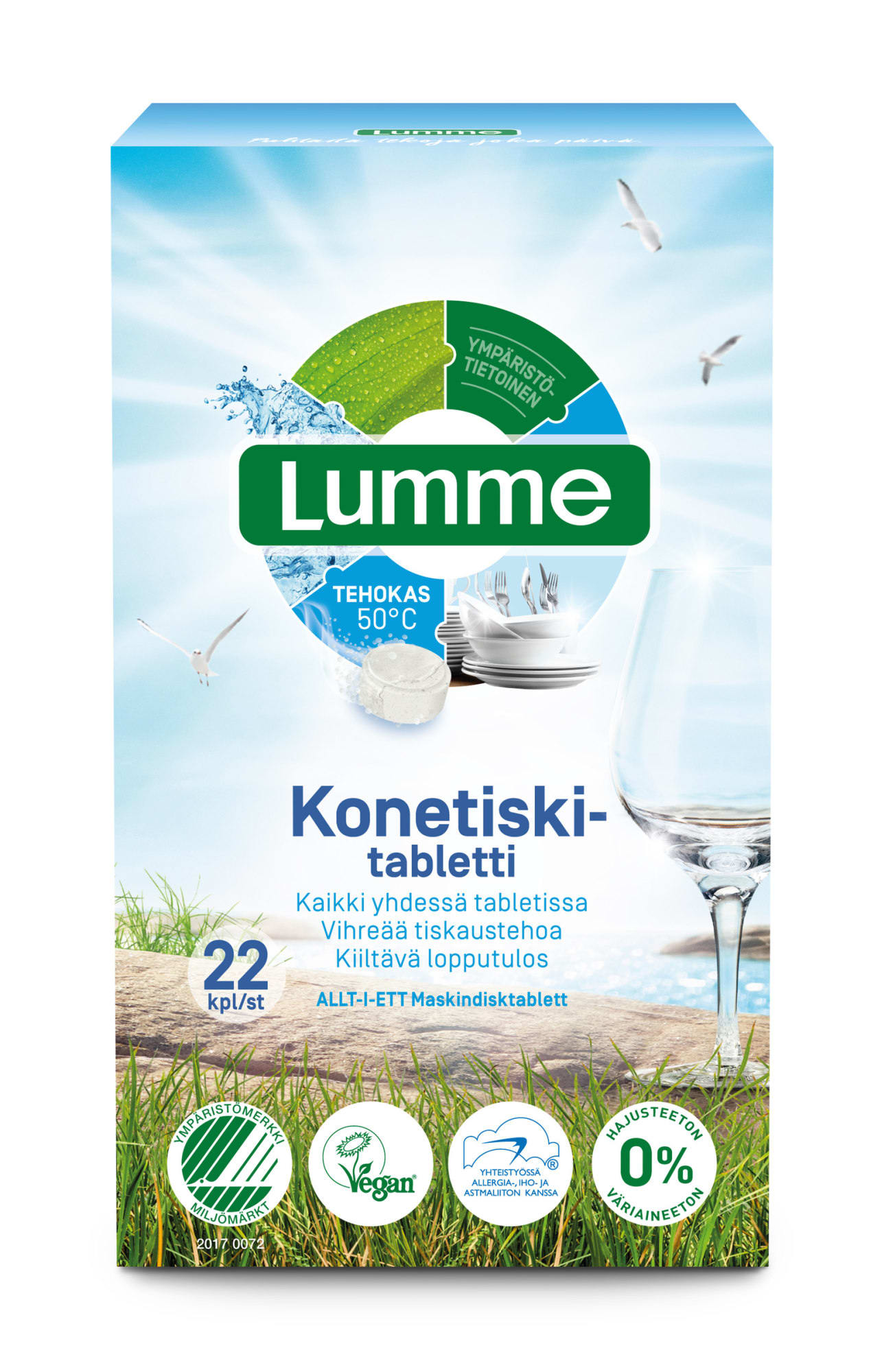 Ympäristömerkitty Lumme Konetiskitabletti puhdistaa astiat puhtaaksi jo alhasemmissa lämpötiloissa. Kaikki yhdessä tabletissa: pesee, kirkastaa ja ehkäisee kalkinmuodostumista. Lumme konetiskitabletti ei sisällä tarpeettomia ainesosia, hajusteita eikä väriaineita. Se on kehitetty yhteistyössä Allergia, Iho ja Astmaliiton kanssa ja täysin kasvipohjainen. Tabletin kalvo on liukeneva. Joutsenmerkitty. Vegaanimerkitty.