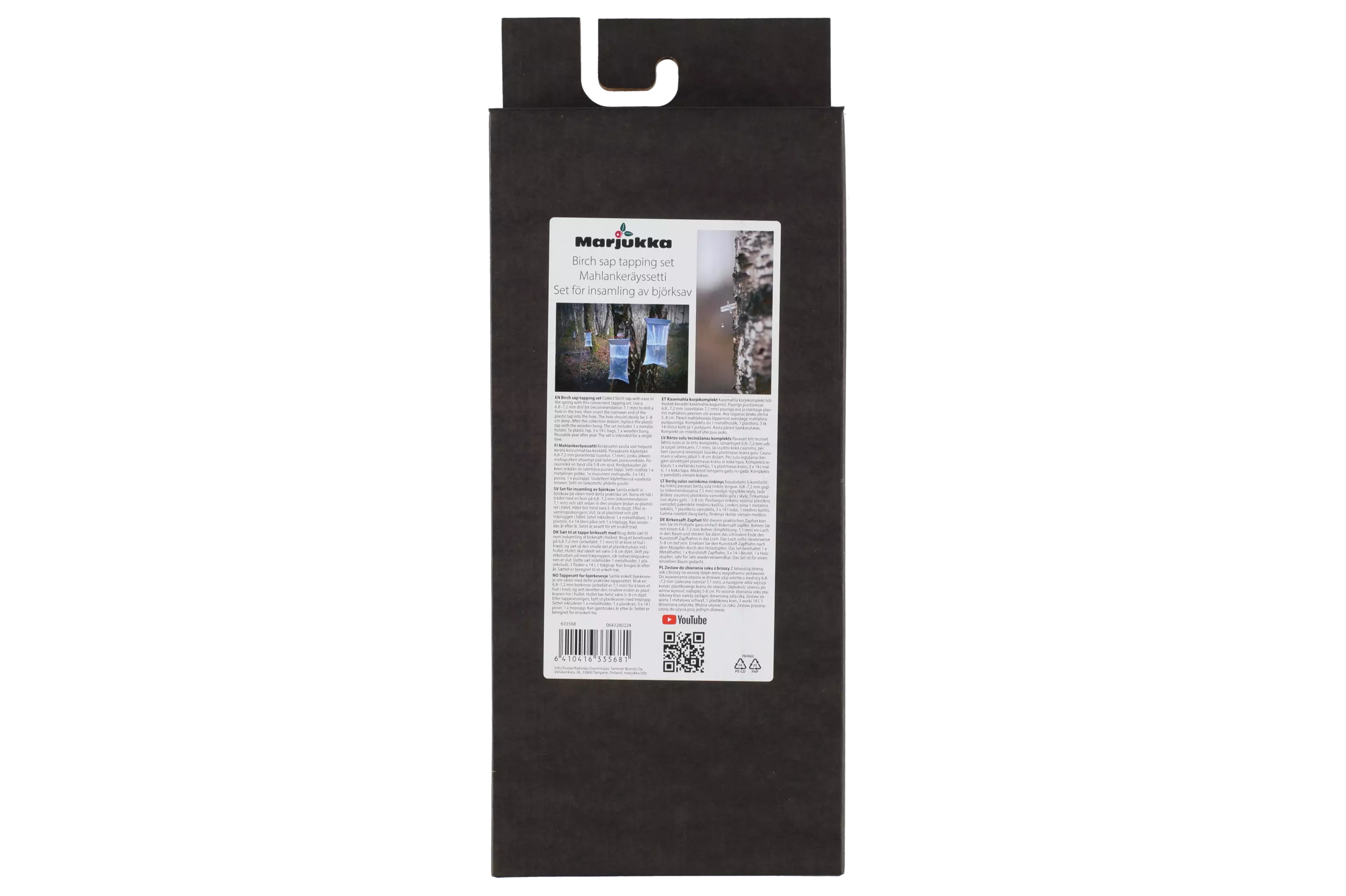 Marjukka Koivunmahlankeräyssetti on erinomainen apu mahlanjuoksutukseen. Mahlan keruuaika alkaa varhain keväällä, kun vuorokauden keskilämpötila on plussan puolella. Keruu jatkuu, kunnes puiden silmut puhkeavat. Mahlan juoksutus Marjukka Koivunmahlakeräyssetillä: Valitse terve koivu, jonka halkaisija on noin 20 cm rinnankorkeudelta. Desinfioi poranterä. Poraa puun varjopuolelle noin 5–8 cm syvä reikä yläviistoon. Käytä porauksessa 6,8–7,2 mm poranterää (suositus 7,1 mm). Puhdista porausreikä ja aseta muovisen mehuputken ohuempi pää porausreikään. Kiinnitä mahlankeräyspussi metalliseen pidikkeeseen ja ripusta pidikkeessä olevasta reiästä mehuputkeen riippumaan. Mahla kerääntyy suoraan pussiin. Käyttäessäsi keruupussia, vähennät roskien ja ötököiden päätymistä mahlan joukkoon. Tyhjennä pussi sen täytyttyä ja aseta uusi pussi tilalle. Koivunmahla pilaantuu herkästi, joten säilö mahla mahdollisimman nopeasti esimerkiksi kerta-annospakkauksiin pakastimeen. Keruukauden päätyttyä porausreikään on laitettava puutappi. Marjukka koivunmahlankeräyssetin edut: helppokäyttöisyys, vähemmän roskia ja ötököitä mahlan seassa, pussien läpinäkyvyys, näet helposti täyttöasteen, uudelleen käytettävyys vuodesta toiseen. Käytäthän aina puhdistettuja keruuvälineitä. Huomioi, ettei mahlankeruu kuulu jokaisenoikeuksiin vaan tarvitsee aina metsänomistajan luvan. Setin sisältö: 1 x metallinen keruupussinpidike, 1x muovinen mehuputki, 3 x 14 L pussia, 1 x puutappi.