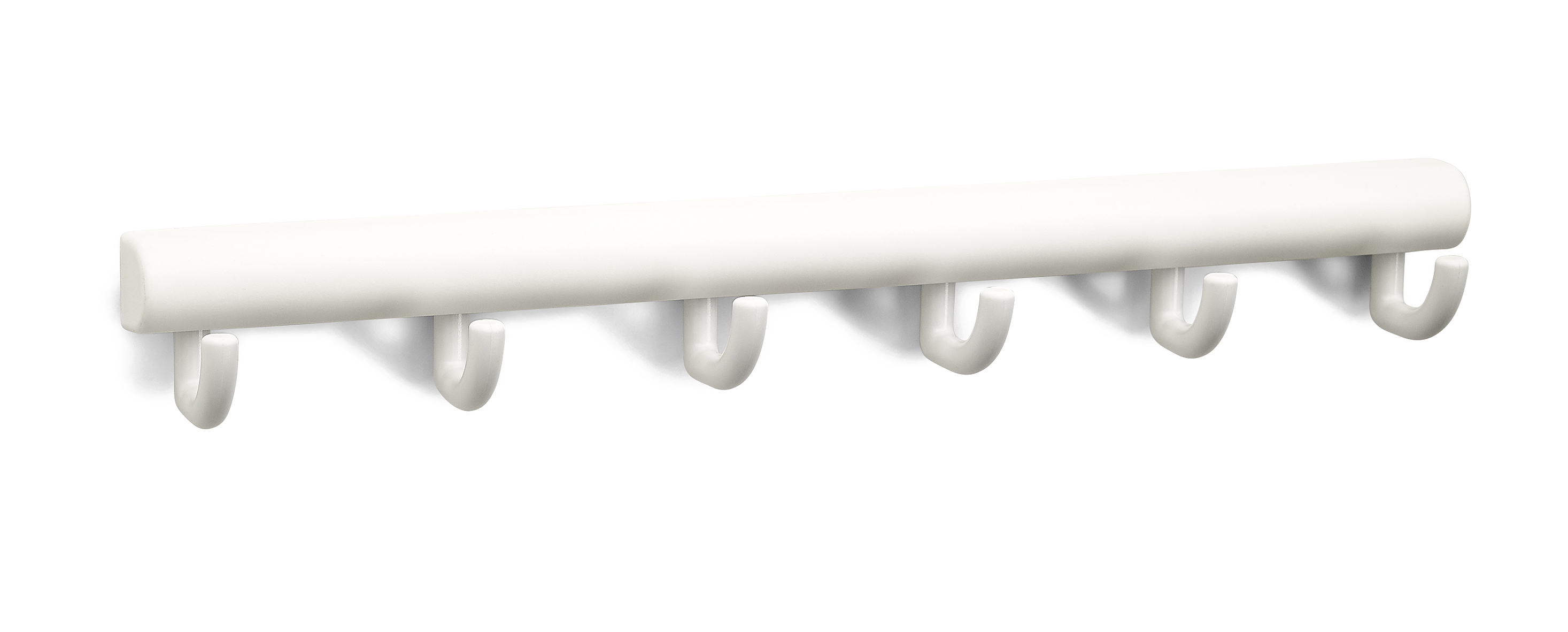 6-koukkuinen naulakko muovista. Kiinnitys ruuveilla tai tarralla.