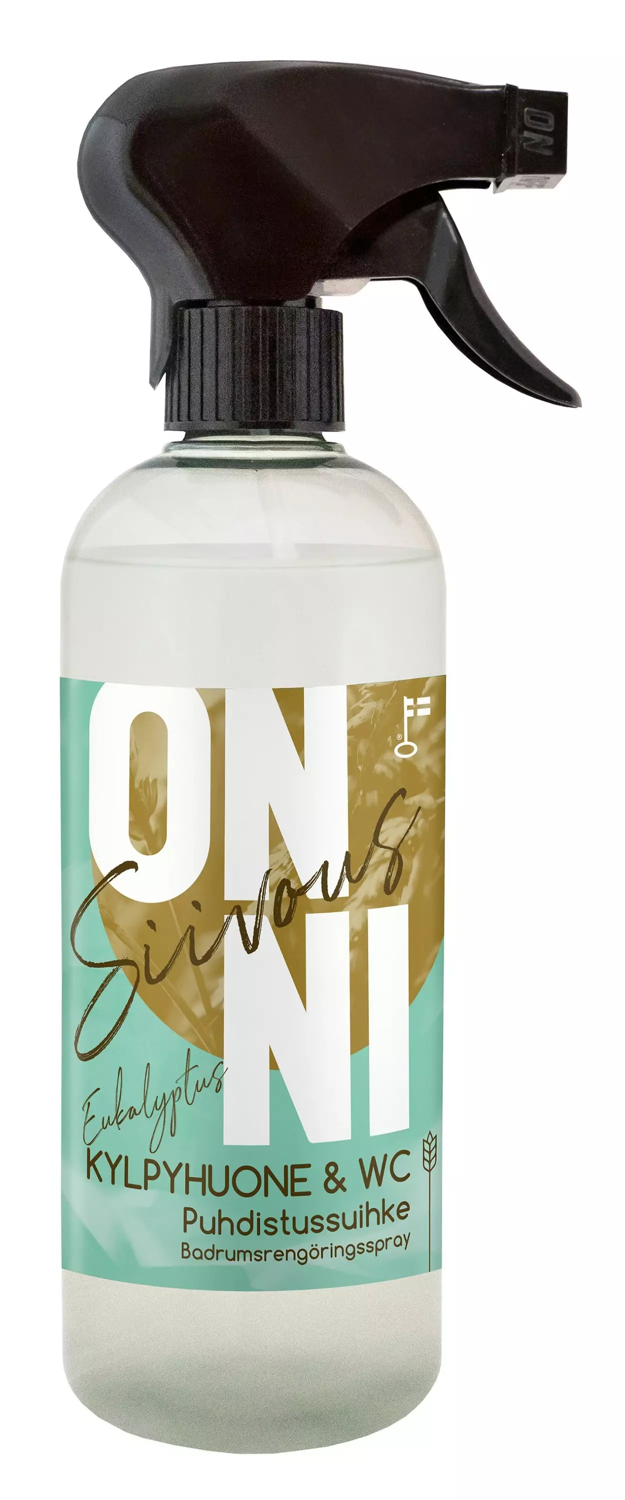 Kotimainen ONNI Kylpyhuone & Wc puhdistussuihke Eukalyptus on kasvipohjainen puhdistusaine kylpyhuoneen ja wc:n pinnoille. Tehokas kalkin ja saippuatahrojen poistoon. Jättää tilaan raikkaan eukalyptuksen tuoksun. Sisältää huolella valittuja ainesosia uusiutuvista raaka-aineista. Siivoaminen käyttövalmiilla ONNI puhdistussuihkeella on erittäin helppoa. Biohajoavat tuotteet ovat vapaita eläinperäisistä raaka-aineista, ja pullo on valmistettu 100% kierrätetystä muovista. Kotimaisuudesta kertoo Avainlippu -merkki.