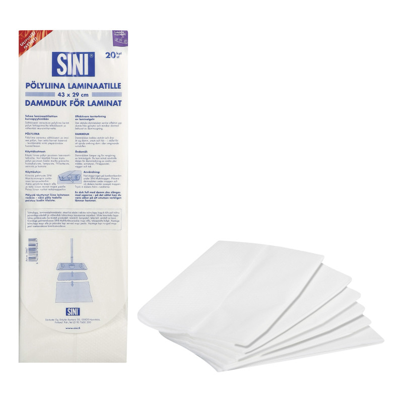 Sähköisesti latautuva pölyliina sopii laminaatti- ja parkettilattioiden hellävaraiseen, mutta tehokkaaseen kuivapyyhintään. Kertakäyttöinen liina poistaa pölyn tehokkaasti levittämättä sitä huoneilmaan. Käsinpyyhintään liina sopii pölyn poistoon kodin kaikilta pinnoilta, kuten huonekaluista, valaisimista, viihde-elektroniikasta sekä seinistä ja katoista. Tehokas lattian kuiville irtoroskille ja pölylle SINI-monitoimimopin ja pehmusteen kanssa.
