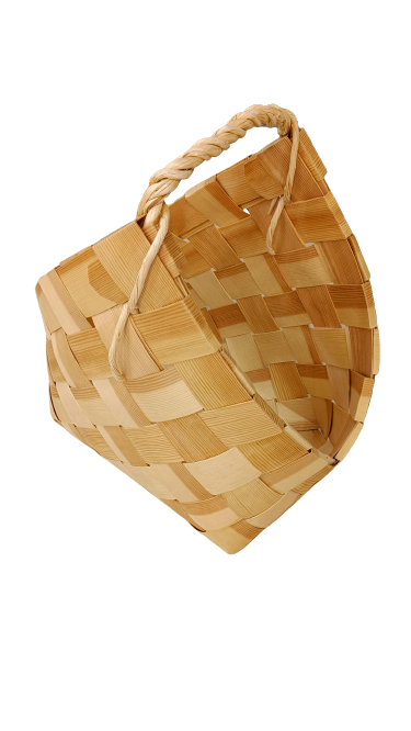 Kaunis puinen puunkantokori. Korkeus n.54cm, leveys n.30cm.