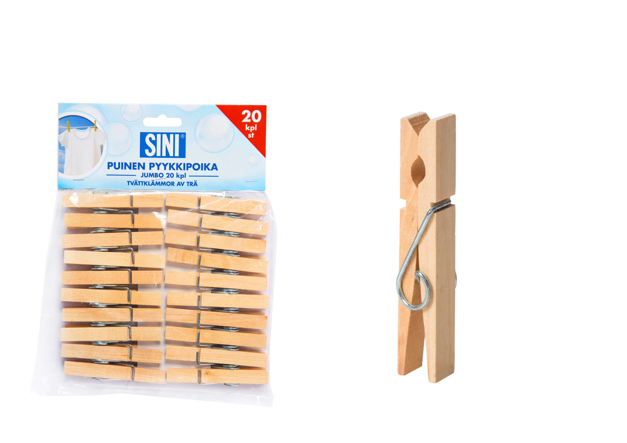 Puinen pyykkipoika on reilunkokoinen ja tukeva. Isosta pyykkipojasta saa hyvän otteen ja sillä voi ripustaa raskastakin pyykkiä kuivumaan. Pakkauksessa on 20 kpl pyykkipoikia.