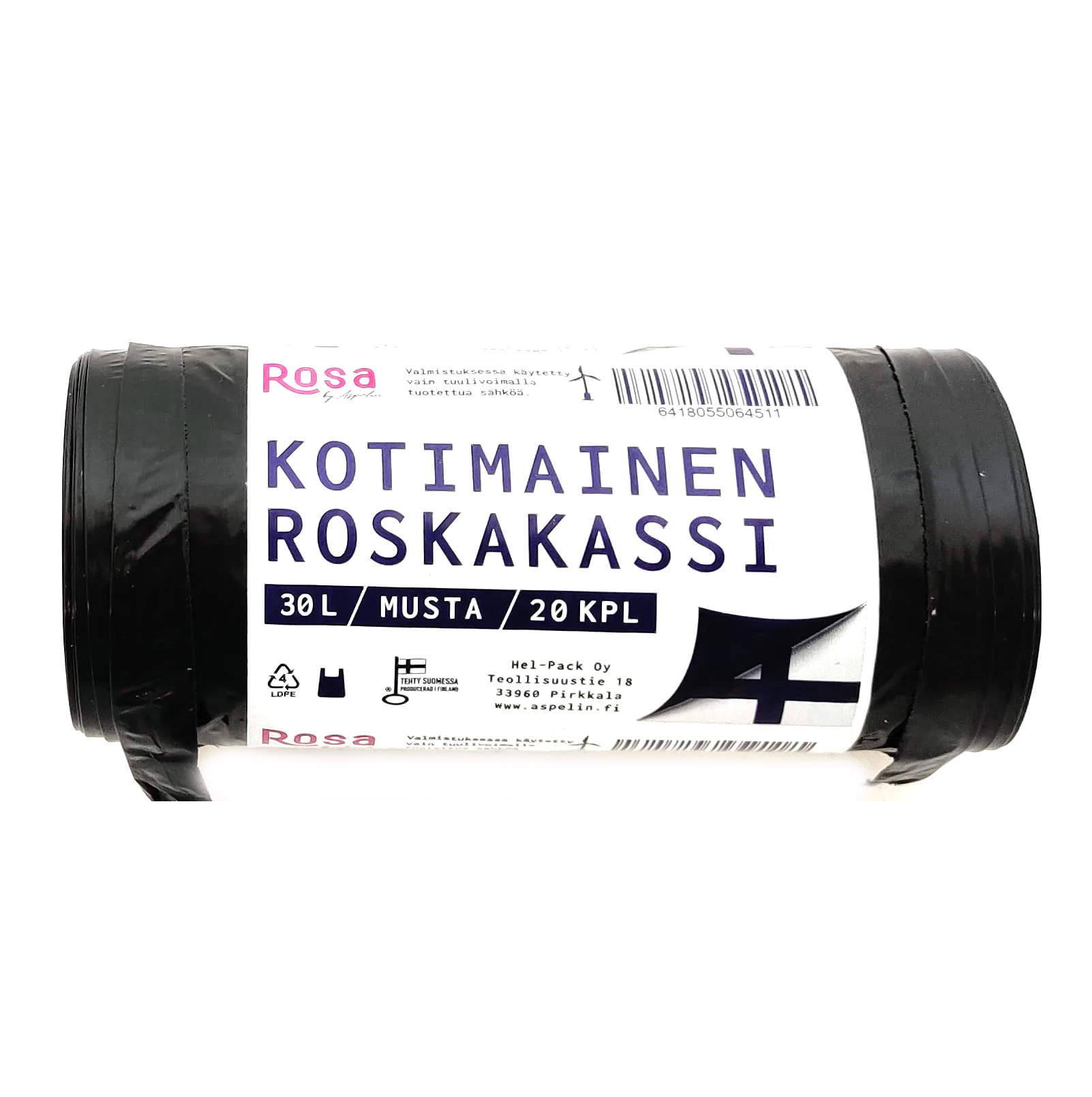 ROSKAKASSI 30L 20KPL 520X600 0,018 kahvallinen Rosa kotimainen musta roskakassi 30 litraa. Koko 52x60 cm, vahvuus 18 my, valmistettu vahvasta LD-PE muovista. Rullassa 20 kpl.