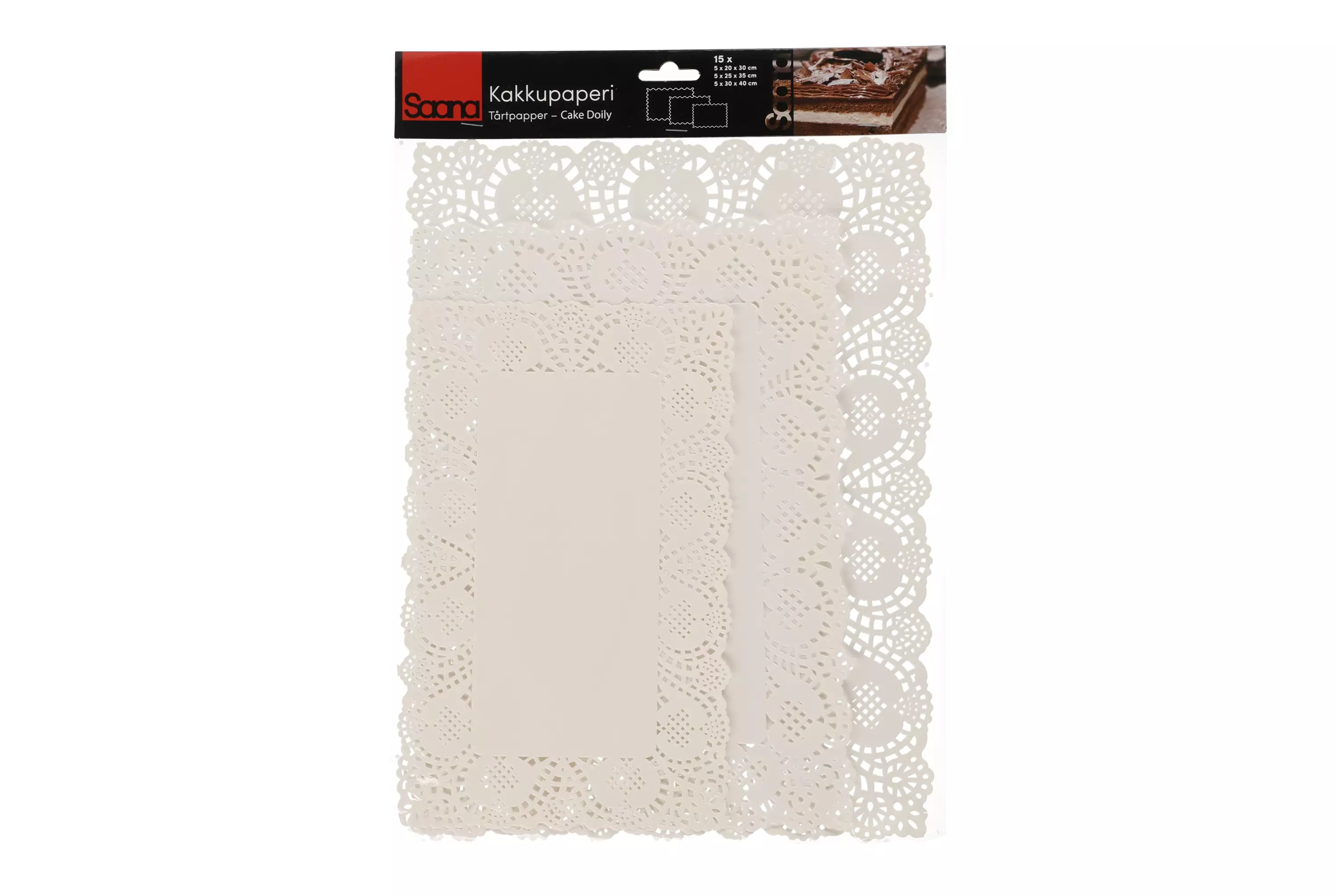 Valkoinen suorakaiteen muotoinen kakkupaperi jossa pitsimäiset reunat. Pakkauksessa 15 kakkupaperia, kolme eri kokoa: 20 x 30 cm 5 kpl, 25 x 35 cm 5 kpl, 30 x 40 cm 5 kpl.