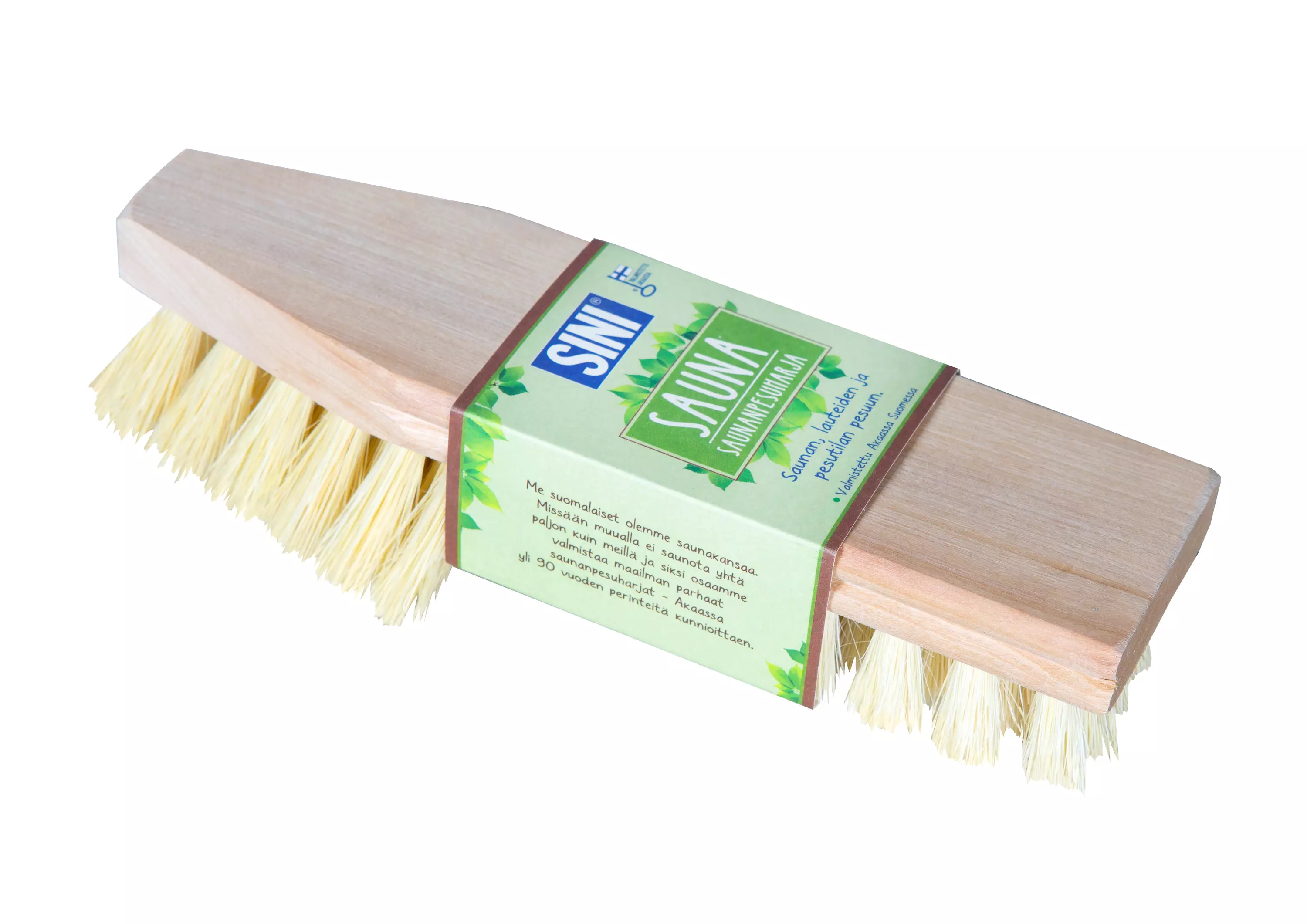 Harjakset luonnonkuitua. Saunan, lauteiden ja pesutilan pesuun. Pitkä etuharjas ylettyy nurkkiin ja lauteiden väliin. Valmistettu Akaassa Suomessa – Avainlipputuote.