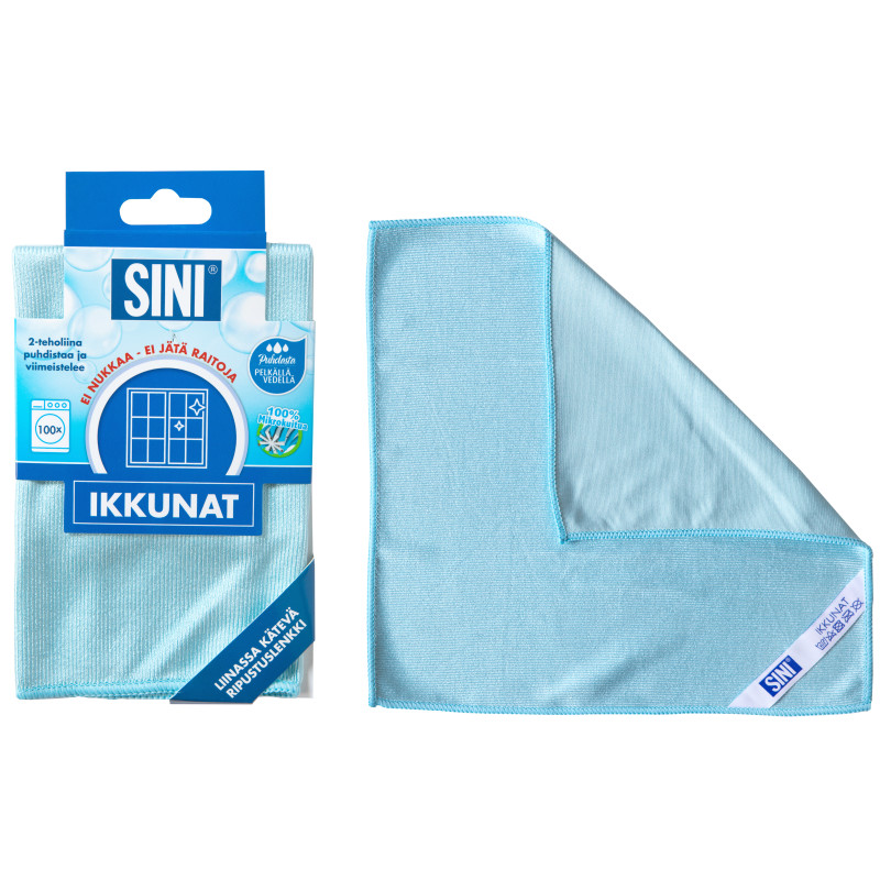 Mikrokuituinen ikkunaliina ikkunoiden ja parvekelasien tehokkaaseen puhdistamiseen. SINI-Ikkunaliinassa on kaksi erilaista pintaa. Kiilamaiset kuidut poistavat lika- ja rasvatahrat pelkällä vedellä. Sileä puoli kuivaa ja viimeistelee ikkunat säihkyvän kirkkaiksi. Liinassa on kätevä ripustuslenkki, jossa lukee käyttökohteen nimi ja liinan saa ilmavasti kuivumaan. Liina kestää kymmeniä pesukertoja pesukoneessa 60 asteessa.