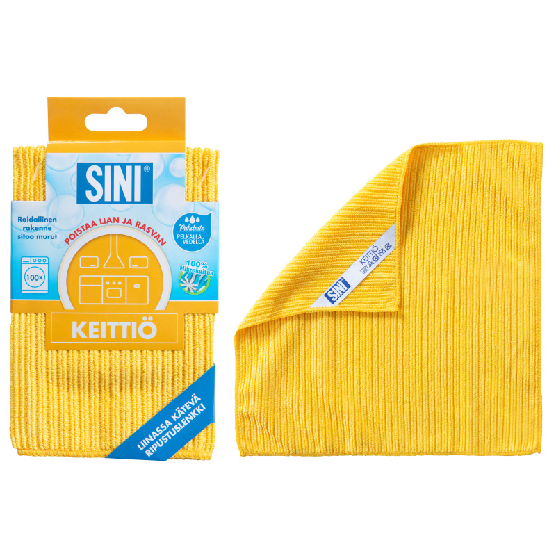 Mikrokuituinen keittiöliina sopii keittiön pintojen tehokkaaseen ja hygieeniseen puhdistamiseen. Liina on imukykyinen ja sen raidallinen rakenne sitoo murut. Nihkeänä irrottaa lian ja rasvan pelkällä vedellä. Liinassa on kätevä ripustuslenkki, jossa lukee käyttökohteen nimi ja liinan saa ilmavasti kuivumaan. Liina kestää kymmeniä pesukertoja pesukoneessa 60 asteessa.