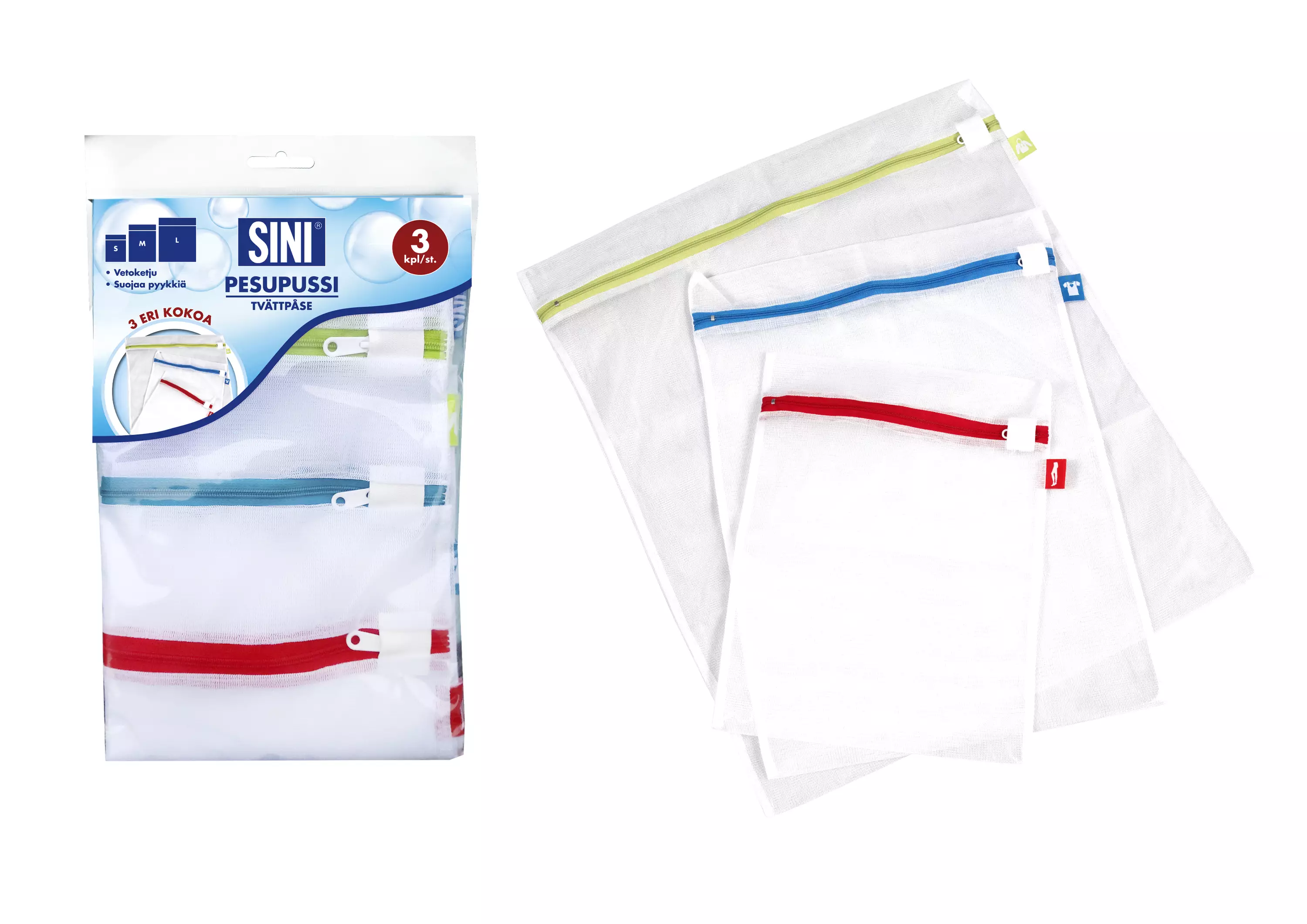 SINI Pesupussi 3 kpl pakkauksessa on kolme eri kokoista pesupussia eri käyttötarkoituksiin. Pesupussi suojaa herkkiä materiaaleja konepesun aikana. Vetoketjulla