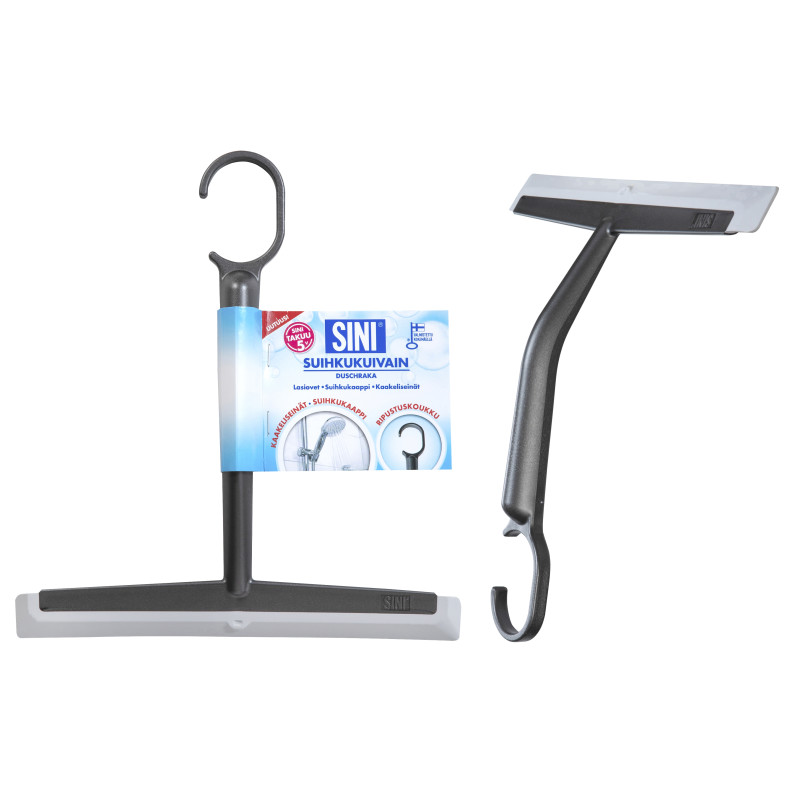 SINI Suihkukuivain on kevyt, näppärä kuivain. Sillä on helppo kuivata kylpyhuoneen ja saunan lasiovet ja -seinät, suihkukaappi, kaakeliseinät sekä peilit. Kuivaimessa on elastomeerinen kuivainosa, joka ei naarmuta kuivattavaa pintaa. Suihkukuivaimessa on kätevä ripustuskoukku, josta se on helppo laittaa roikkumaan vaikka suihkun putkista. Näin kuivain on aina käden ulottuvilla.