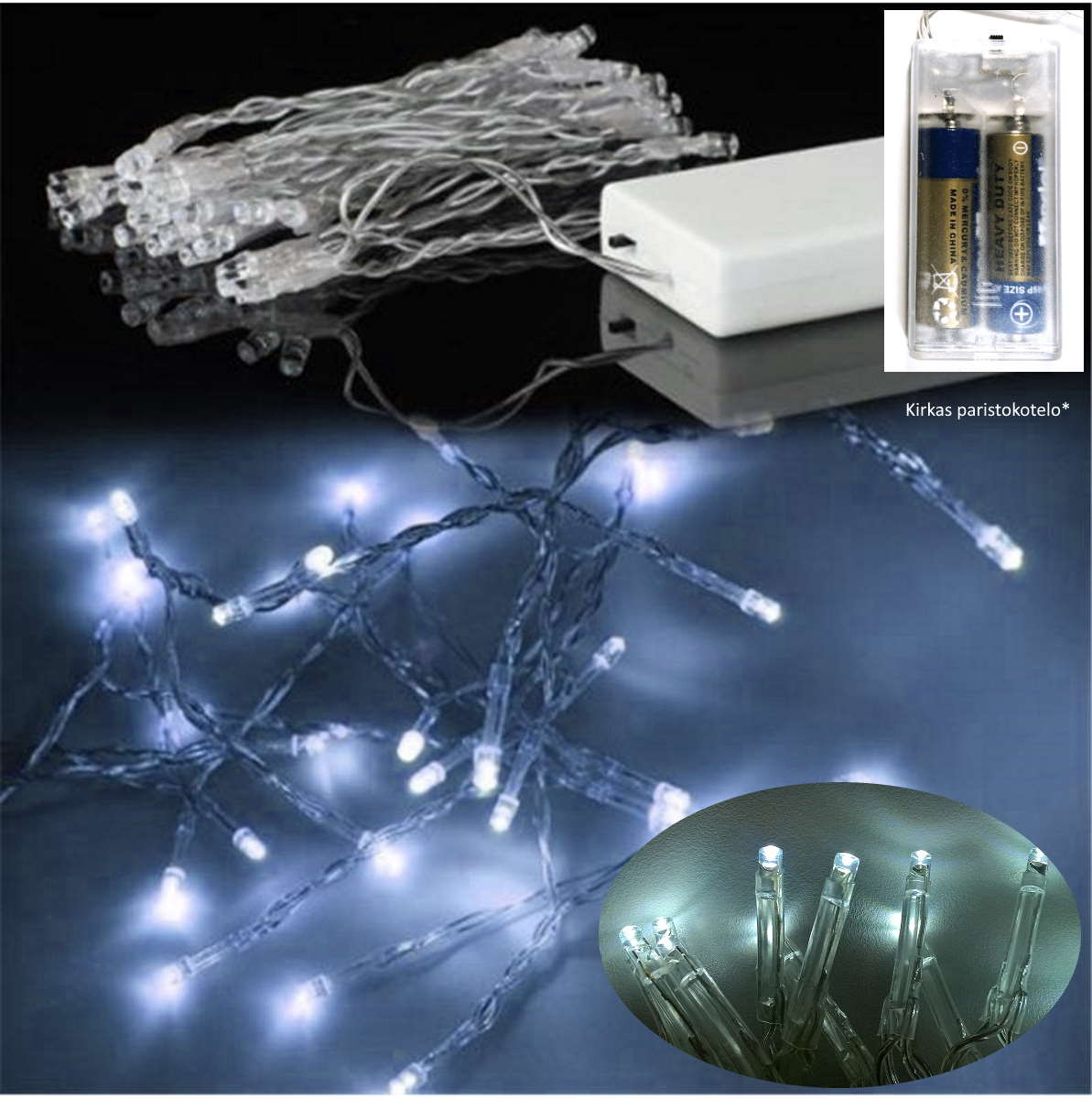 Paristoilla toimiva sisäkäyttöön tarkoitettu led-valosarja viileän valkoisilla valoilla. Paristojen ansiosta on helppo sijoittaa minnevain, vaikka kauniiseen vaasiin tms. Paristotarve 2xAA(ei sisälly pakkaukseen).