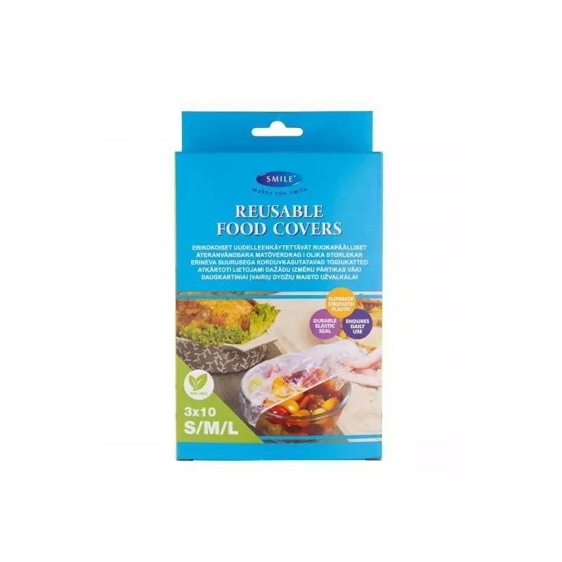 Smile Reusable Food Covers -tuoresuojahupat ovat kätevä ja ekologinen vaihtoehto kelmulle ja foliolle. Pakkauksessa on 30 kpl suojahuppuja: 10 kpl kutakin kokoa (S/M/L), joten löydät helposti sopivan hupun jokaiselle kulholle, lautaselle tai tarjoiluvadille.