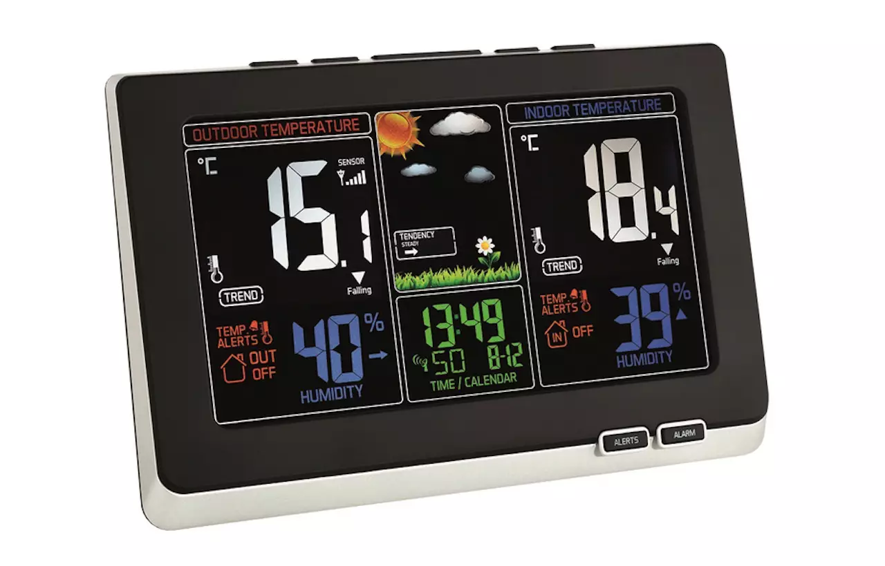 Monipuolinen Suomen Lämpömittari 7920 -sääasema näyttää helposti luettavalta värinäytöltä sekä sisä- että ulkoilman olosuhteet. Laite antaa sääennusteen kuudella värillisellä symbolilla ja seuraa lämpötilaa sekä kosteutta reaaliajassa.