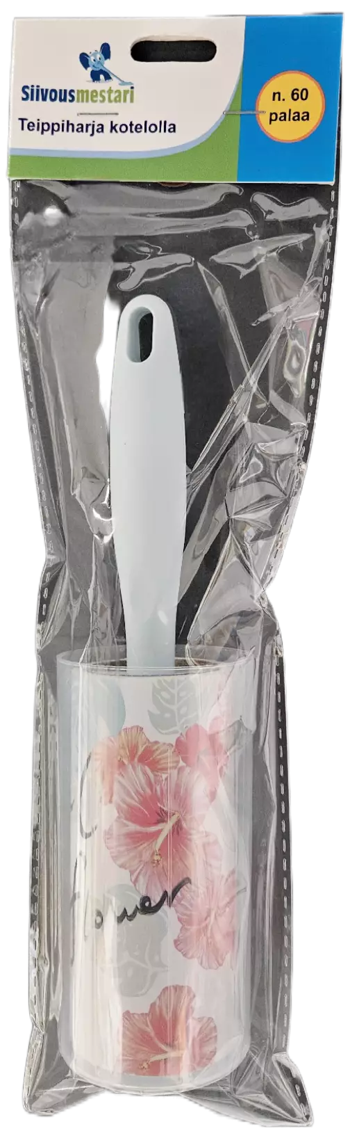 Kätevä pakkaus, jossa 2 vararullaa teippiharjaan. Yhdessä rullassa noin 60 irrotettavaa arkkia pölyn, nukan ja karvojen poistoon.