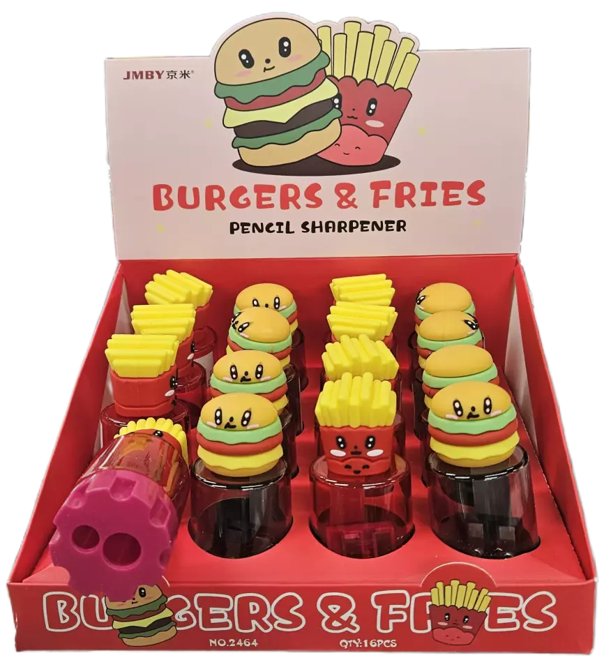 Kätevä ja laadukas teroitin koulu- ja kotikäyttöön! Myyntiyksikkö sisältää yhden teroittimen, halkaisija 3,5 × 8 cm. Saatavana kahdessa hauskassa vaihtoehdossa: hampurilainen tai ranskalaiset.