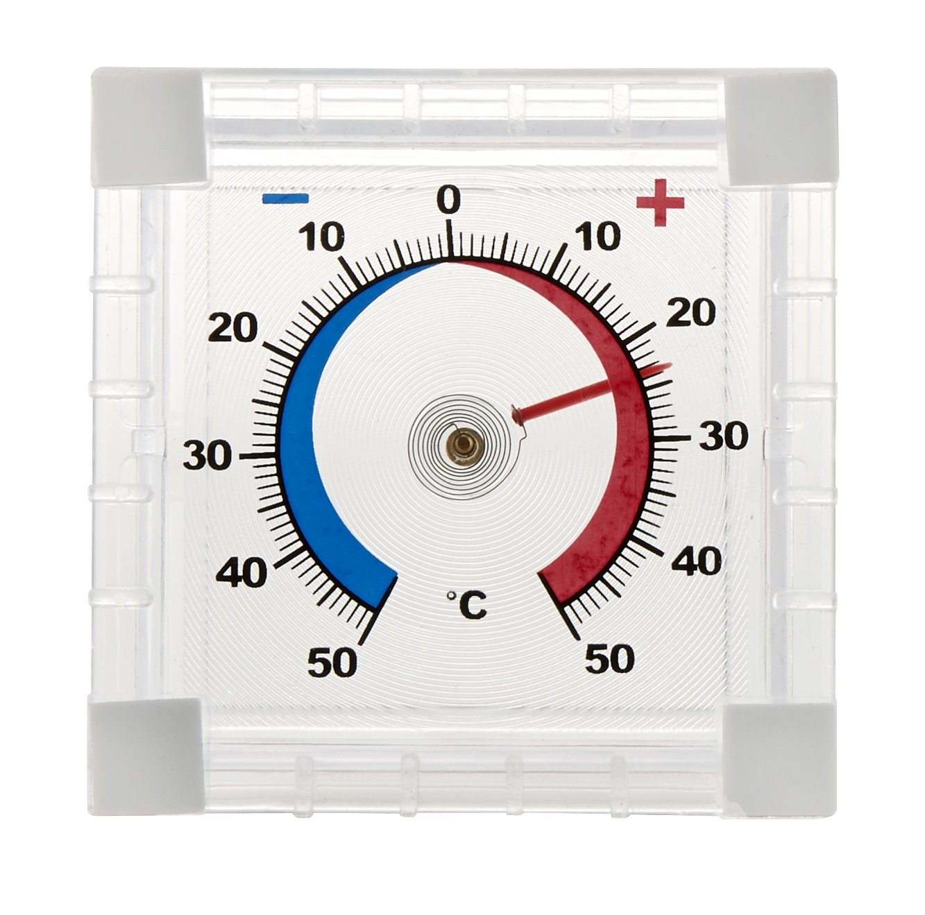 Helposti luettava ulkolämpömittari viisarinäytöllä. Kiinnitetään tarroilla ikkunalasiin. Mittausalue on -50..+50°C. Mittarin koko on 7,5 x 7,5 cm.