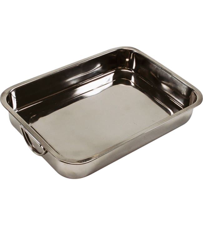 Perinteinen, ruostumattomasta teräksestä valmistettu uunivuoka tyylikkäillä kädensijoilla sopii mainiosti myös kattaukseen.