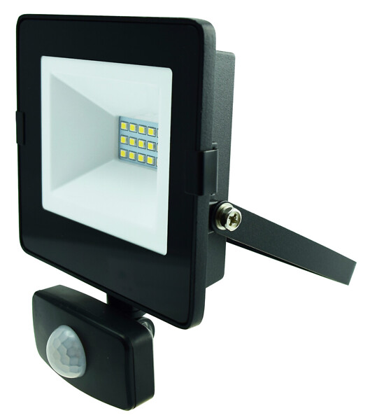 PIR-liiketunnistimella varustettu 10 W led-valonheitin valaistukseen sisällä ja ulkona. Valoteho 800 lm. Musta runko alumiinia. Paloajan-, tunnistusherkkyyden- ja valoherkkyyden säätö. Myös PIR-tunnistimen asento säädettävissä.