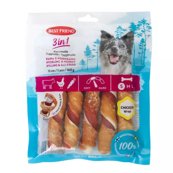 Best Friend 3 in 1 kierrerulla on lihaisa puruluu, jossa on kolme makua herkullisessa paketissa. Naudannahkainen pururulla tarjoaa sopivasti puruvastusta ja porkkananmakuinen kasvistäyte on sitkeää purtavaa vahvemmillekin leuoille. Vastustamaton kanakierre kruunaa maistuvan puruelämyksen koirille aktivoiden pureskelemaan. Best Friend Bones 3in1 kierrerulla soveltuu erinomaisesti pienille ja keskikoisille koirille ja on myös on oiva herkku suurille koirille. Kätevässä pakkauksessa on iloa pitkäksi aikaa. Purutuotteiden säännöllinen käyttö auttaa ylläpitämään hampaiden ja ikenien terveyttä ja ehkäisemään samalla pahanhajuista hengitystä. Lisäksi purutuotteet tarjoavat erinomaista ajanvietettä ja piristävät tehokkaasti tylsiä hetkiä herättäen koirien luontaisen puruvietin.
