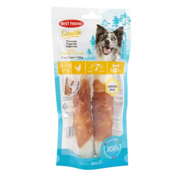 Best Friend Double pururulla kanafileellä on herkullinen yhdistelmä korkealaatuista naudannahkaa ja aitoa kanafilettä. Sitkeä naudannahka antaa paljon haastetta hampaille ja maistuva kanafilee aktivoi koiraa ja saa nirsommankin koiran innostumaan pureskelusta. Double pururulla kanafileellä on helposti sulava, sisältää runsaasti proteiinia ja vain vähän rasvaa. Pururulla on erinomainen valinta keskikokoisille ja suurille koirille, joilla on keskivahva puruvoima. Tuote sopii mainiosti myös pienemmille koirille, joilla on vahva puruvoima. Purutuotteiden säännöllinen käyttö auttaa ylläpitämään hampaiden ja ikenien terveyttä ja ehkäisemään samalla pahanhajuista hengitystä. Lisäksi purutuotteet tarjoavat erinomaista ajanvietettä ja piristävät tehokkaasti tylsiä hetkiä herättäen koirien luontaisen puruvietin.
