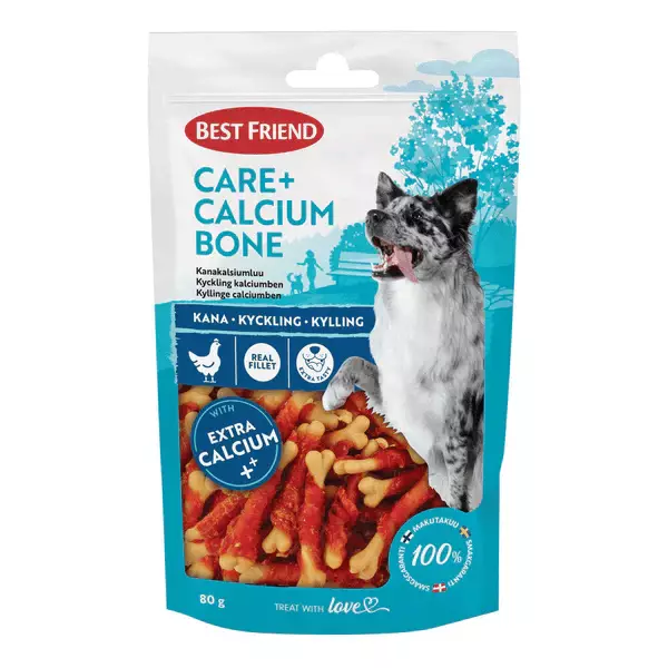 Best Friend Care+ Chicken Calcium Bone kanakalsiumluu koiran herkku on luun muotoinen kasvipohjainen kalsium makupala aidolla kanafileekääreellä. Tämä rapea koiran makupala on täydellinen päivittäinen palkkio kaikenkokoisille koirille. Lisätty kalsium auttaa tukemaan koirien yleistä hyvinvointia. Tämän koiran herkun rakenne ja korkea kalsiumpitoisuus auttavat myös vähentämään hammaskiveä ja ehkäisemään pahanhajuista hengitystä. Care+ kanakalsiumluu ei sisällä viljaa, lisättyä sokeria eikä lisäaineita, joten se on erinomainen vaihtoehto myös herkille koirille. Kalsiumin lähde on kalsiumkarbonaatti. Hemmottele koiraasi tällä herkullisella ja hyvää tekevällä makupalalla. Aina on aikaa herkkuhetkelle! Treat with love. Kätevä uudelleensuljettava pakkaus.