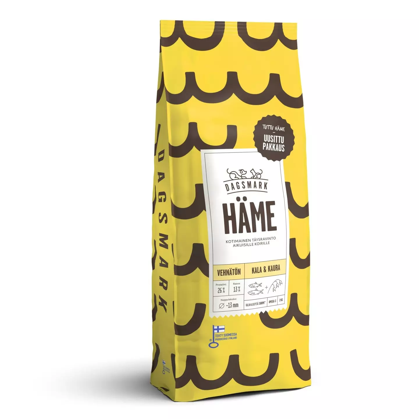 - Kanaton - Vehnätön - Villiä Itämeren kalaa - Gluteenitonta ja vatsaystävällistä kauraa - 13 % rasvaa, 26 % proteiinia - Valmistettu Suomessa Vehnätön täysravinto aikuiselle koiralle. Dagsmark HÄME on villiä Itämeren kalaa ja kauraa sisältävä kuivaruoka. Itämeren silakka on ekologinen ja ravinnerikas raaka-aine, joka on hyvä lähde sydänystävällisille EPA- ja DHA-rasvahapoille, jotka tukevat nivelien, sydämen, aivojen ja silmien luonnollista hyvinvointia. Kotimainen kaura on luontaisesti gluteenitonta ja tunnetaan vatsaa hellivistä kuiduistaan, ja se sopiikin myös monelle herkkävatsaiselle koiralle. Kotimainen camelinaöljy on hyvä omega-3- ja 6-rasvahappojen lähde, jotka ravitsevat koiran turkkia ja ihoa. Dagsmark HÄME tukee koirasi hyvinvointia ja sisältää kaikki koirasi tarvitsemat kivennäisaineet sekä vitamiinit. Kuivaruoka ei sisällä vehnää, kanaa, kananrasvaa, lohiöljyä, soijaa, maissia eikä säilöntä-, aromi- tai väriaineita. Dagsmark haluaa täyttää tassukansan ruokakupit mahdollisimman vastuullisesti Suomessa tuotetulla lemmikinruoalla. HUOM! Resepti uudistuu 2025 aikana. Tarkista tuotteen ainesosat myös myyntipakkauksesta.