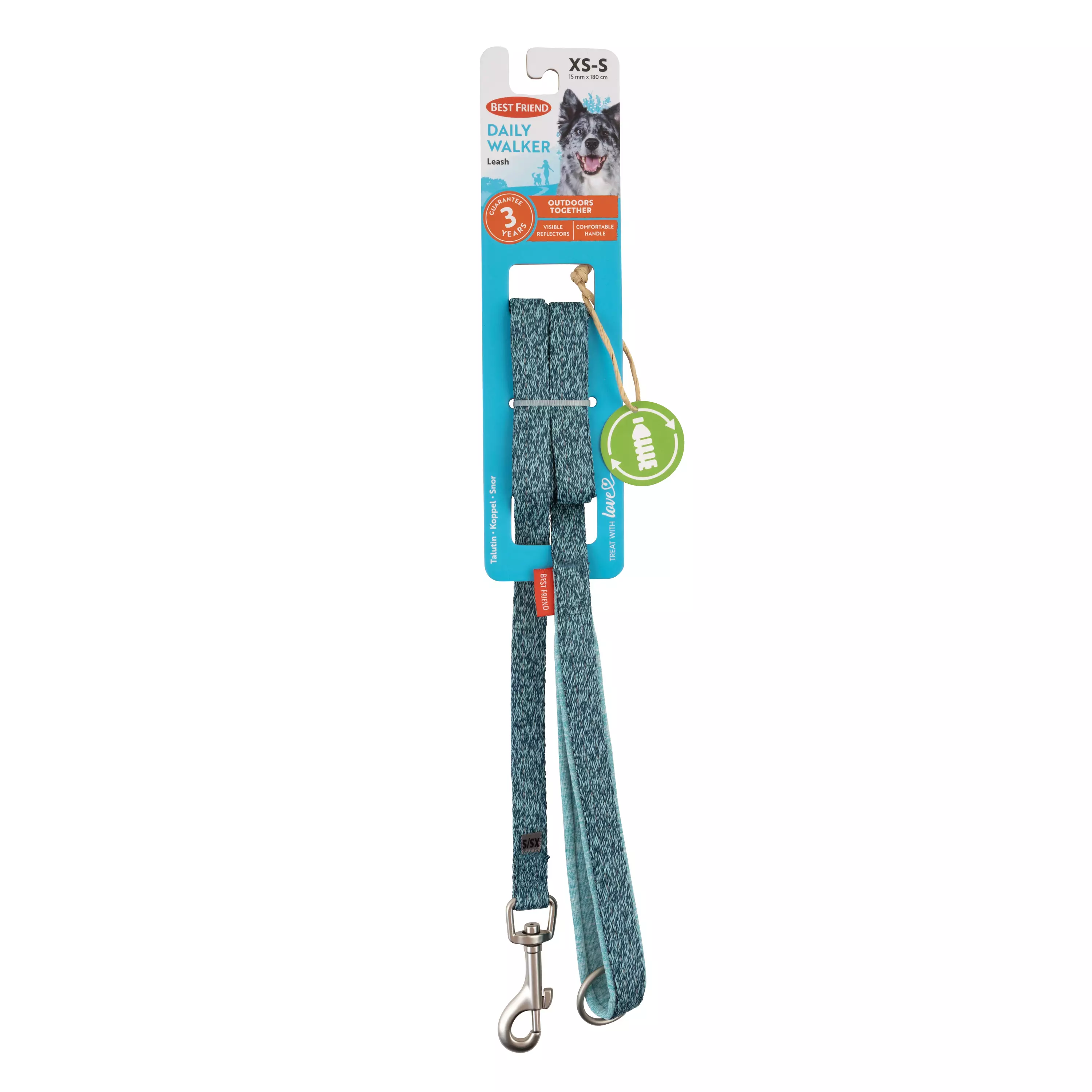 Best Friend Daily Walker XS-S heijastintalutin on tukeva koiran hihna, joka sopii kaikille pienille koirille ja useimmille pennuille. Heijastava talutushihna sopii erittäin hyvin päivittäiseen lenkkeilyyn ja harrastuksiin. Pehmustettu kahva tuntuu mukavalta kädessä ja antaa hyvän tuen. Hihnassa on kestävä lukko ja nauhaan kudottu tehokas heijastin, joka lisää näkyvyyttä ja turvallisuutta pimeällä. Talutin on valmistettu GRS-sertifioidusta, kierrätetystä 100 % PET-materiaalista ja kahvan pehmuste on pehmeää neopreeniä. Kaikki Daily Walker -heijastintaluttimet ovat vetolujuustestattua laatua. Parhaan kaverin mukana kaikissa seikkailussa! Värivalikoima. Treat with love.