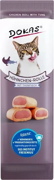 Pehmeä ja vastustamaton Dokas kanarulla tonnikalasydämellä hurmaa myös nirsoimmat kissat! Herkullinen yhdistelmä kanaa ja tonnikalaa tekee tästä luonnollisen ja proteiinipitoisen välipalan.