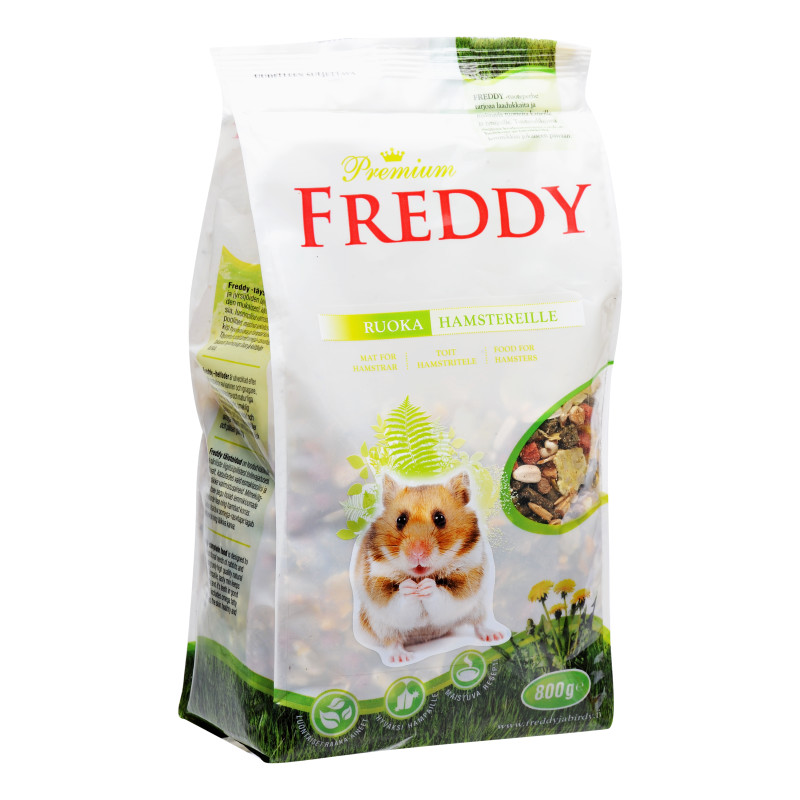 Freddy täysrehu hamstereille. Ensiluokkaisia, luonnollisia valmistusaineita. Monipuolinen, maistuva sekoitus pitää lemmikkisi hyvinvoivana ja hampaat kunnossa. Täysrehun sisältämät omega-3 rasvahapot takaavat hyvinvoivan ihon ja kiiltävän turkin. Freddy ruoka hamstereille sisältää hamstereiden ruokavalioon tarvittavaa eläinproteiinia. Sopii kaikille hamsterilajeille. Pakkauskoko 800 g.