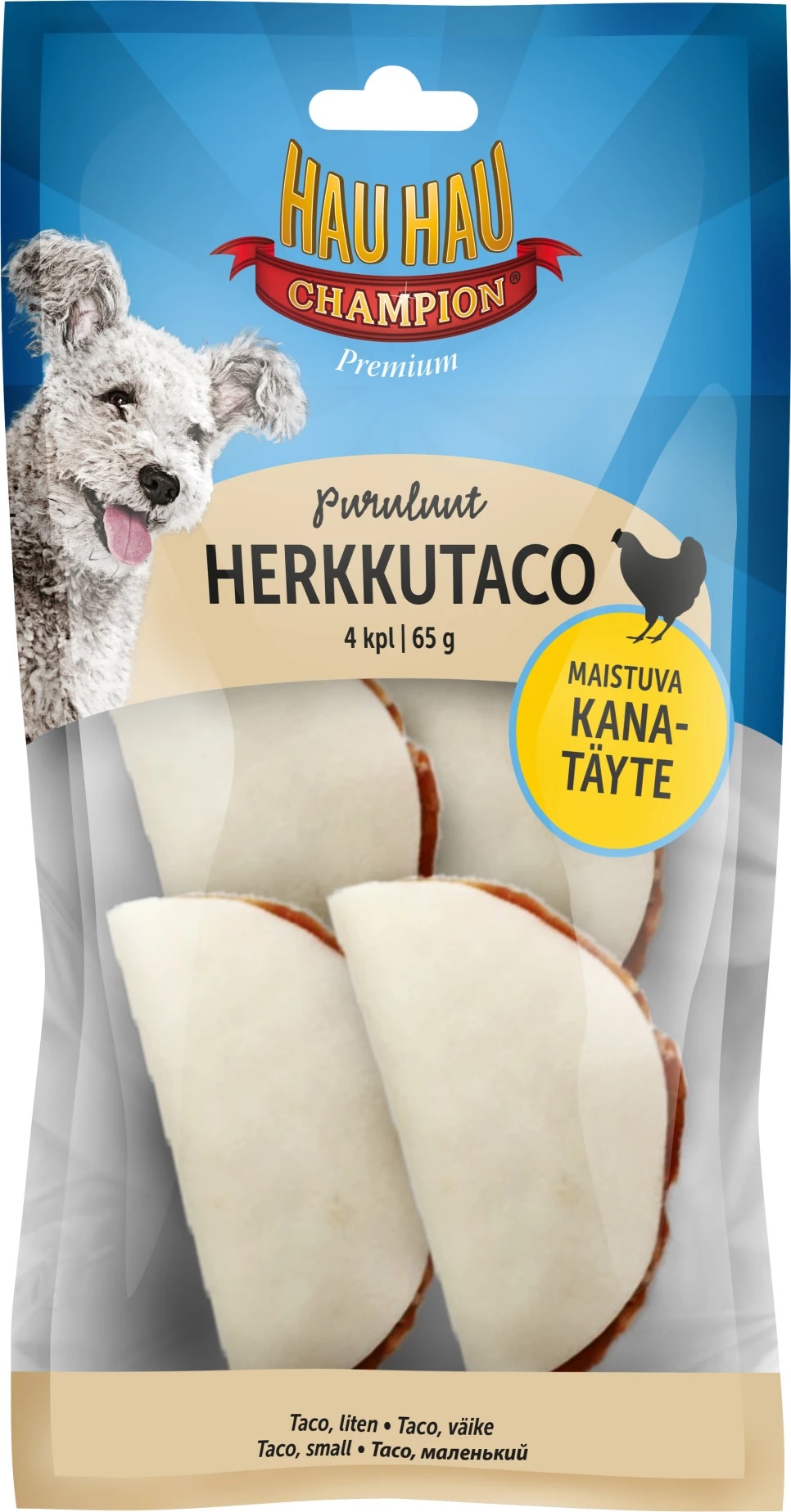 Hau-Hau Champion Herkkutaco on tacon muotoon kääritty naudannahkainen puruherkku maistuvalla kanatäytteellä. Kaksi kokoa: isossa pussissa kaksi isoa tacoherkkua ja pienessä pussissa neljä... Lue lisää