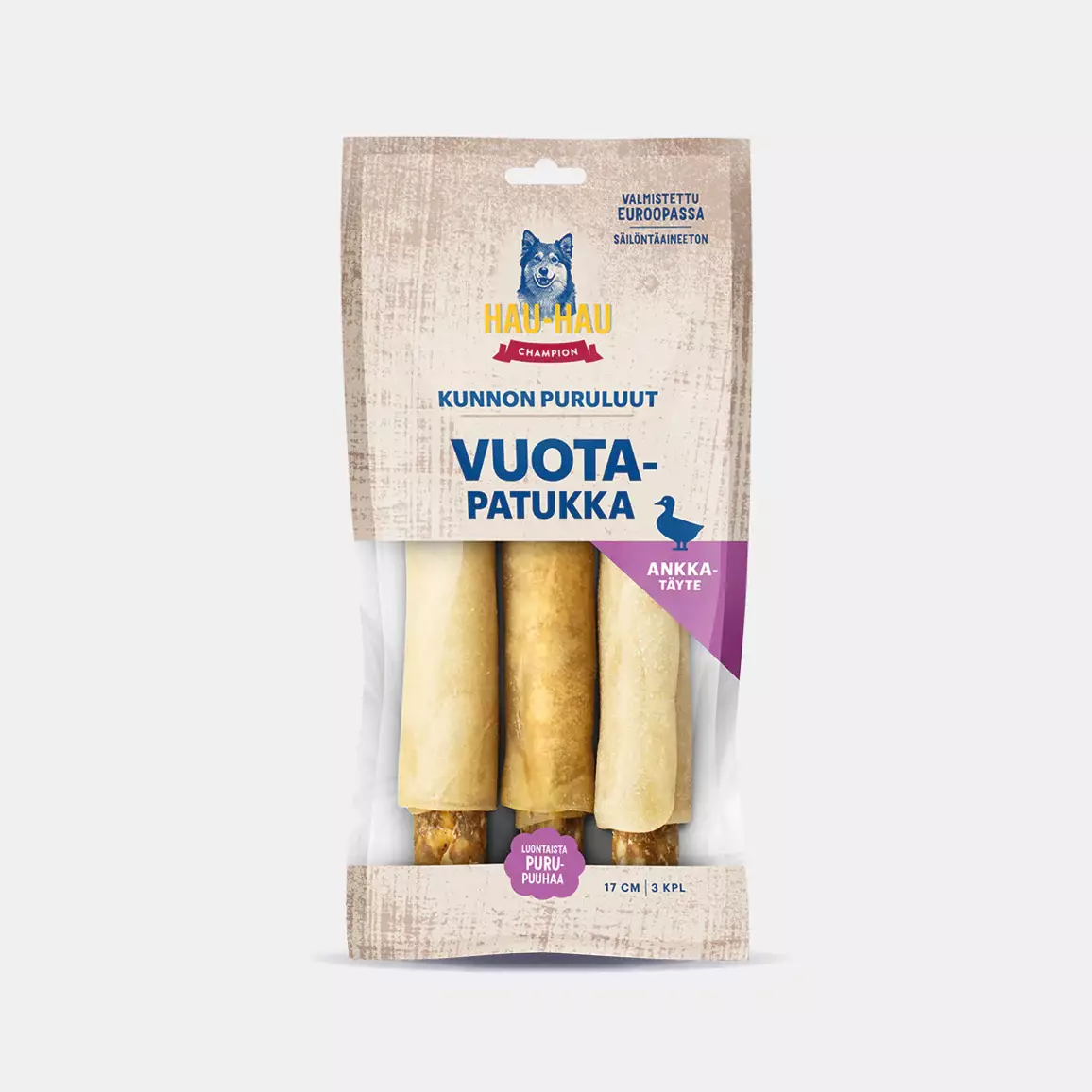 Hau-Hau Champion Vuotapatukka ankka on maistuva puruluu, jonka naudannahkaisen sitkeän kuoren alle on kätketty ankkaa sisältävä rouhetanko. Puruluun houkutteleva tuoksu ja herkullinen maku voivat saada nirsonkin koiran viihtymään pureskelun parissa.