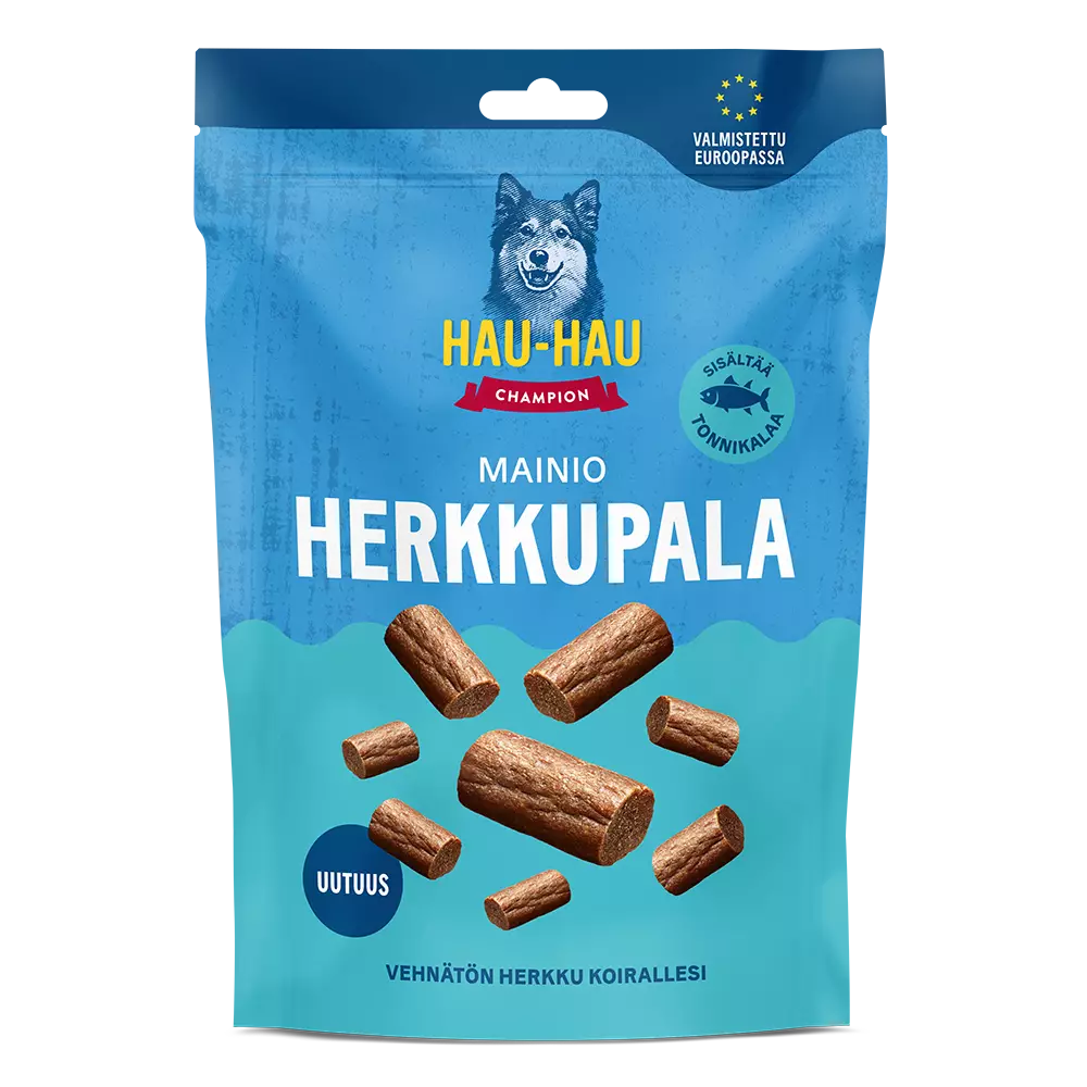 Hau-Hau Champion Mainio Herkkupala Tonnikalaa on suussa sulava klassikkoherkku koirallesi. Tonnikalan makuinen herkkupala on pilkottu pieneksi suupalaksi, joten se sopii sellaisenaan treeninamiksi. Vehnättömät herkkupalat sopivat hännänheiluttajasi sekä hemmotteluhetkiin että mukaan harrastuksiin. Mainiot herkut on valmistettu Euroopassa, ja ne ovat myös erinomaisia tuliaisia koirakavereille.