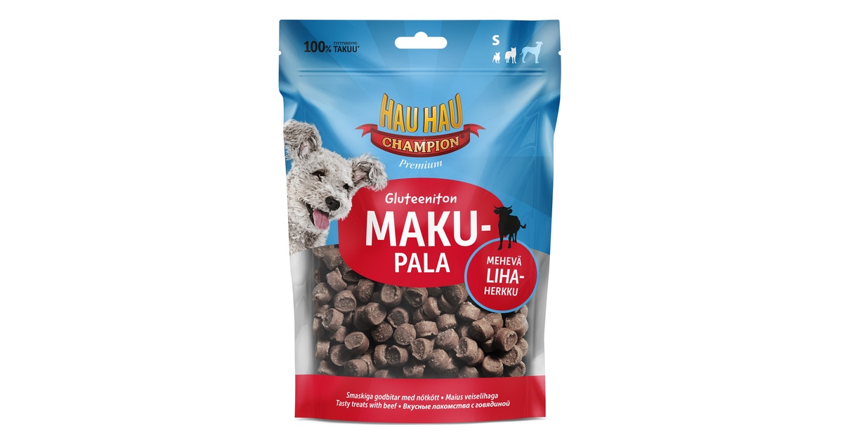 Maistuva Makupala sopii erinomaisesti kaikkeen palkitsemiseen; se on sopivan kiinteä ettei se sotke taskua, mutta herkullisen pehmeä purtavaksi. Gluteenittoman Makupalan makuna naudanliha. S-koko sopii erityisen hyvin pienille ja keskikokoisille koirille.