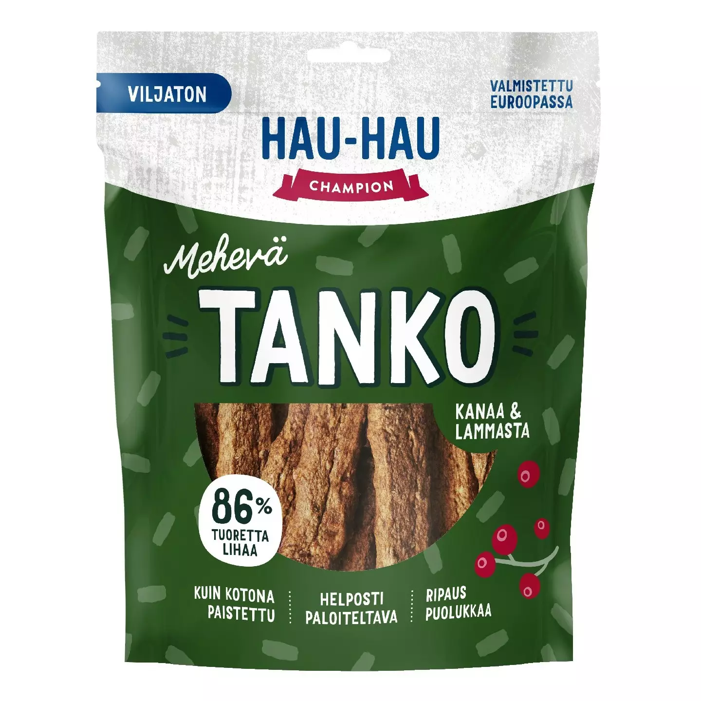- Viljaton koiranherkku - 86 % tuoretta lihaa - Ripaus puolukkaa - Ei viljaa, soijaa tai sokeria - Helppo paloitella murustelematta - Valmistettu Virossa, suunniteltu Suomessa Näillä herkuilla valloitat koiraystäväsi sydämen! Hau-Hau Championin Mehevät Tangot on muotoiltu lihaisasta taikinasta, johon on lisätty ripaus marjapuristetta. Tuloksena syntyi kuin kotona paistettu makupala, jonka voit paloitella helposti pienemmäksi murustelematta. Nämä Hau-Haun omalla tehtaalla Virossa valmistetut herkut eivät sisällä lainkaan viljaa, soijaa tai sokeria. Mehevissä herkuissa käytetyt marjapuristeet syntyvät kylmäpuristettujen mehujen sivutuotantona. Niiden sisältämät marjojen kuoret ja siemenet ovat marjojen ravintorikkaimmat osat, ja siemenöljy sisältää runsaasti hyviä rasvahappoja.