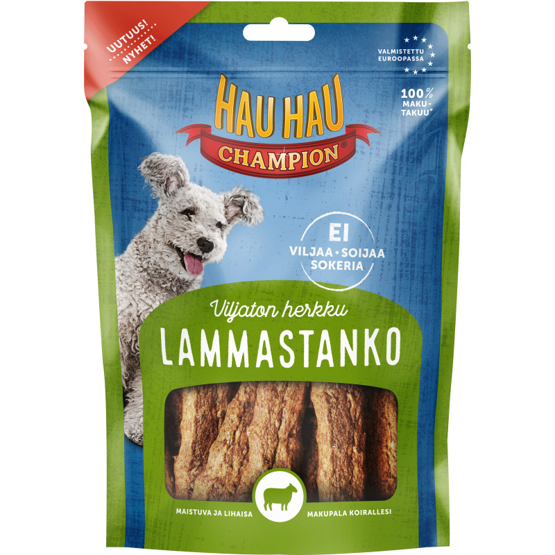 ukutteleva paistopinta, helposti paloiteltava, runsaasti lihaa, eikä lainkaan viljoja. Tätä kaikkea on uusi koiranherkku, Hau-Hau Champion Lammastanko. Lammastanko ei sisällä lainkaan soijaa tai lisättyä sokeria. Sen Suomessa kehitetty resepti ja Virossa valmistetun koiranherkun koostumus on suunniteltu sopimaan täydellisesti nopeaksi palkkioksi iloisissa suorituksissa.