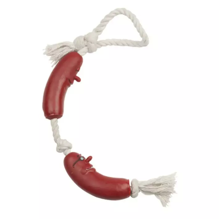 **Yksi köysi, johon on kiinnitetty kaksi silikonimakkaraa.** Interaktiivinen purulelu, jonka makkara-muoto houkuttelee lemmikkisi huomion. Saatavilla sisä- ja ulkopuolelle leikkimistä ja koulutusta... Lue lisää