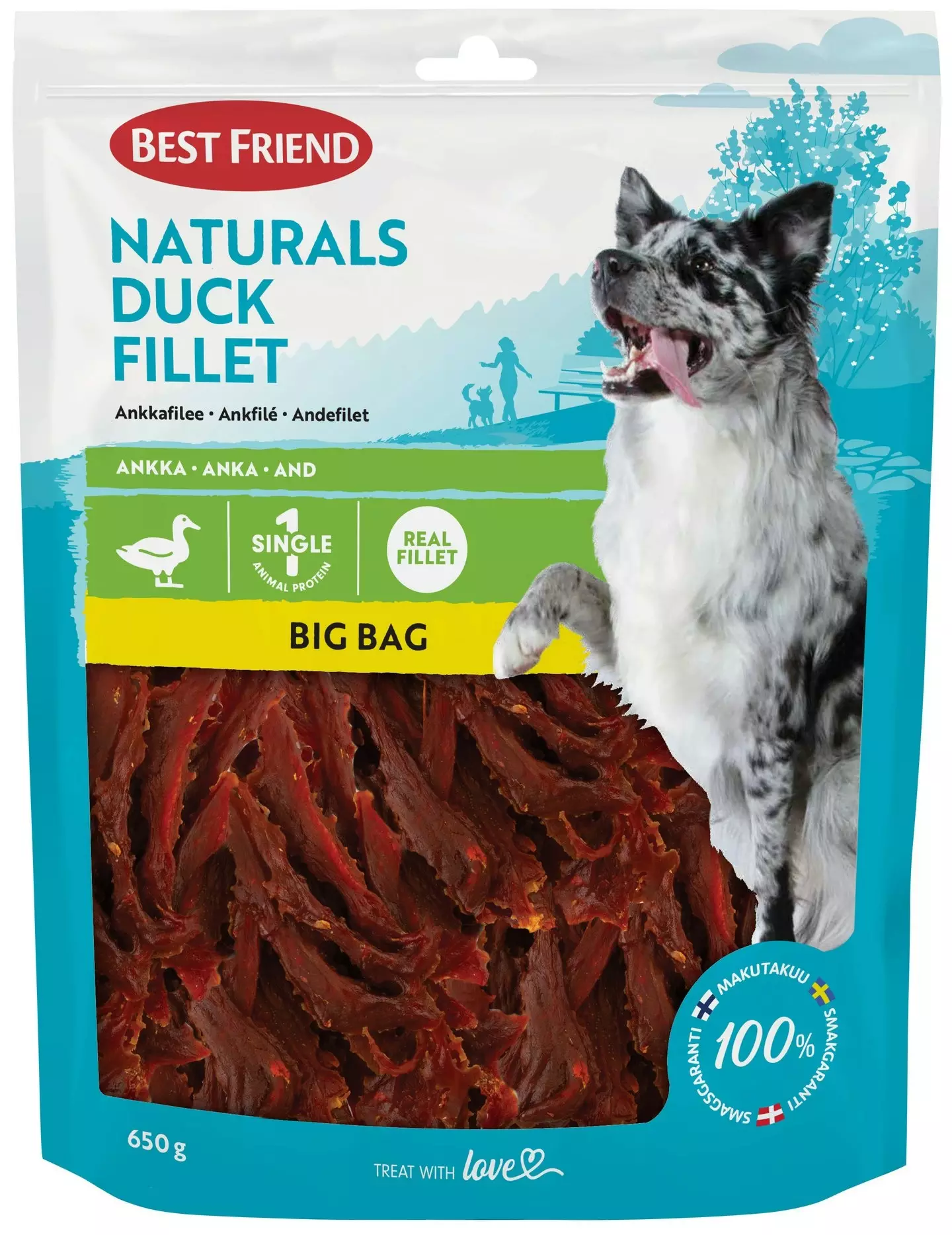 Best Friend Naturals Duck Fillet ankkafilee on erittäin maukas ja laadukas klassikkoherkku, joka sopii kaikille aikuisille ja kaikenkokoisille koirille. Tämä perinteinen paahdettu koiraherkku sisältää paljon proteiinia yhdestä ainoasta proteiinilähteestä; aidosta ankanfileestä. Sitkeä rakenne ja vastustamaton maku saavat koirat nautiskelemaan tämän herkun viimeistä murua myöten. Naturals Duck Fillet ankkafileessä ei ole viljaa, sokeria eikä lisäaineita, mikä tekee tästä proteiinipitoisesta herkusta erinomaisen valinnan kaikille koirille, moniin erilaisiin ruokavalioihin. Ankkafilee on ihanteellinen herkku myös koirille, jotka ovat herkkiä kanalle. Aitoa lihaa oleva ankkafilee koiranherkku on helppo rikkoa ja siksi se soveltuu hyvin esim. koiran kouluttamiseen. Palkitse koirasi herkullisella ankkafileellä ja hän palkitsee sinut varmasti huimilla tempuilla! Runsaasti herkkua muhkeassa 650 g:n pakkauskoossa ja kätevässä uudelleensuljettavassa pakkauksessa.
