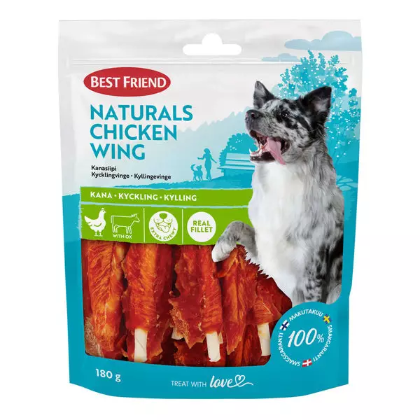 Best Friend Naturals Chicken Wing kanasiipi on koiran herkku, jossa on purtavaa! Tässä hauskassa 2-in-1-herkussa on maukaus härkä purutikku, joka on kääritty suussa sulavalla ja aidolla kananrintafileellä. Korkea lihapitoisuus ja kaksi erilaista koostumusta yhdistettynä hauskaan muotoon herättävät jokaisen koiran kiinnostuksen. Naturals Chicken Wing kanasiipi on runsas ja pitkäkestoinen koiran herkku tai välipala, joka tyydyttää myös koiran pureskelun tarpeen. Tässä herkussa ei ole viljaa, lisättyä sokeria eikä lisäaineita ja siksi se on hyvä valinta kaikille koirille, ja moniin erityyppisiin ruokavalioihin. Kanasiipi päivässä saa murheet pois koiran mielestä! Treat with love. Kätevä uudelleensuljettava pakkaus.