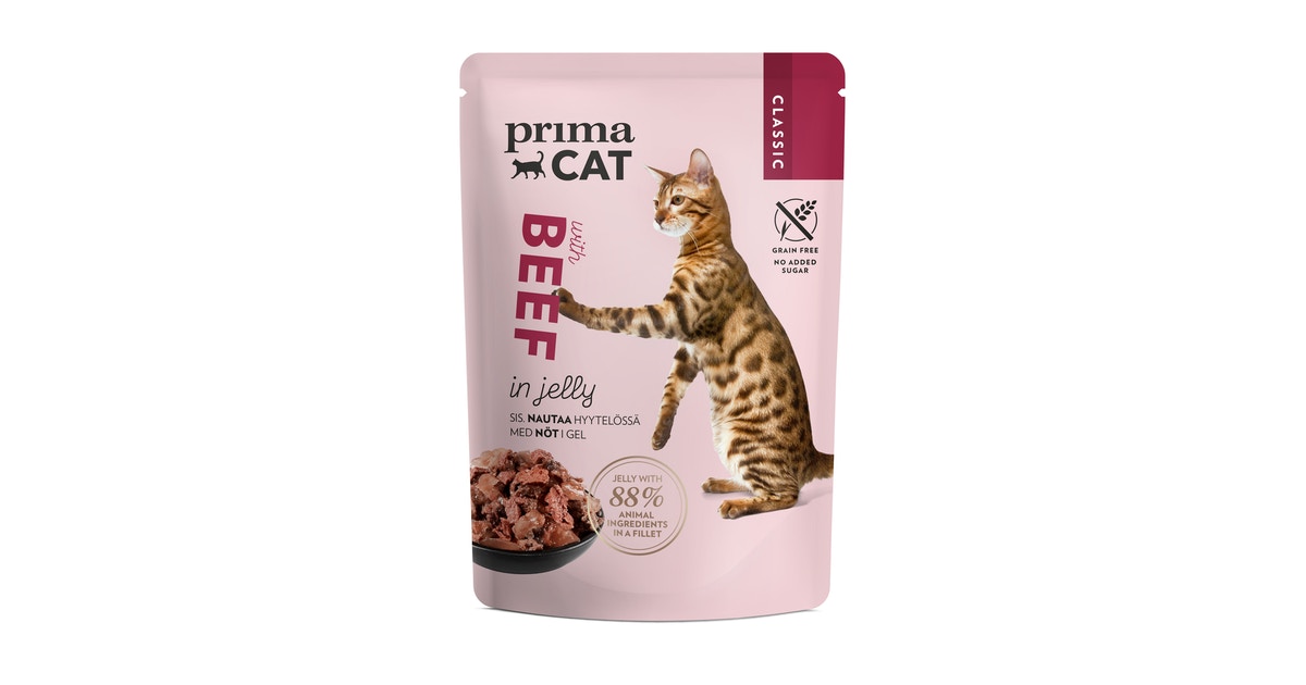 PrimaCat Nautaa hyytelössä -annospussit ovat helppo tapa tarjota kissallesi päivittäinen ruoka-annos lihaisaa märkäruokaa. Täysravintopussissa on puolet herkullista hyytelöä, puolet meheviä naudanmakuisia lihasuikaleita. Lisäksi reseptimme on sokeriton ja viljaton, eikä se sisällä maissia, soijaa tai geenimuunneltuja ainesosia. Nämä ominaisuudet tekevät Classic-kissanruoistamme ainutlaatuisia täysravintoja markettien kissanruokahyllyssä.