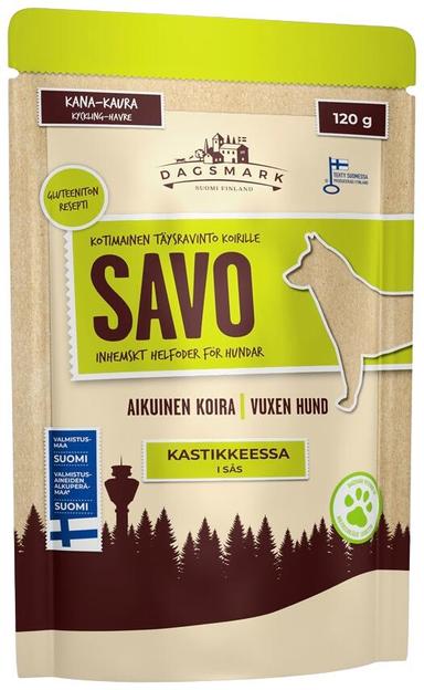 Kotimainen koiran märkäruoka koirasii hyvinvointia ajatellen. Ruoassa on maukas ja proteiinipitoinen koostumus. Dagsmark SAVO sisältää suomalaista maistuvaa kanaa ja kauraa kastikkeessa. Kana on kasvatettu ilman antibioottia. Ruoka sisältää kaikki koirasi tarvitsemat kivennäisaineet sekä vitamiinit. Dagsmark SAVO ei sisällä soijaa, lisättyä sokeria, säilöntä- tai väriaineita. Ainesosat: Kana, vesi, kaura, rypsiöljy, peruna, sakeuttamisaineet, kivennäisaineet