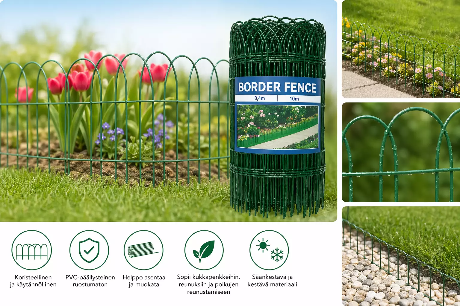 Aitaverkko (puutarha-aita, reunusaita, metalliverkko) on käytännöllinen ja siisti ratkaisu pihan rajaukseen ja kasvien suojaamiseen. Tämä PVC-pinnoitettu vihreä aitaverkko sopii erinomaisesti puutarhaan, kukkapenkkien ympärille ja kevyisiin aidanrakennuksiin.
