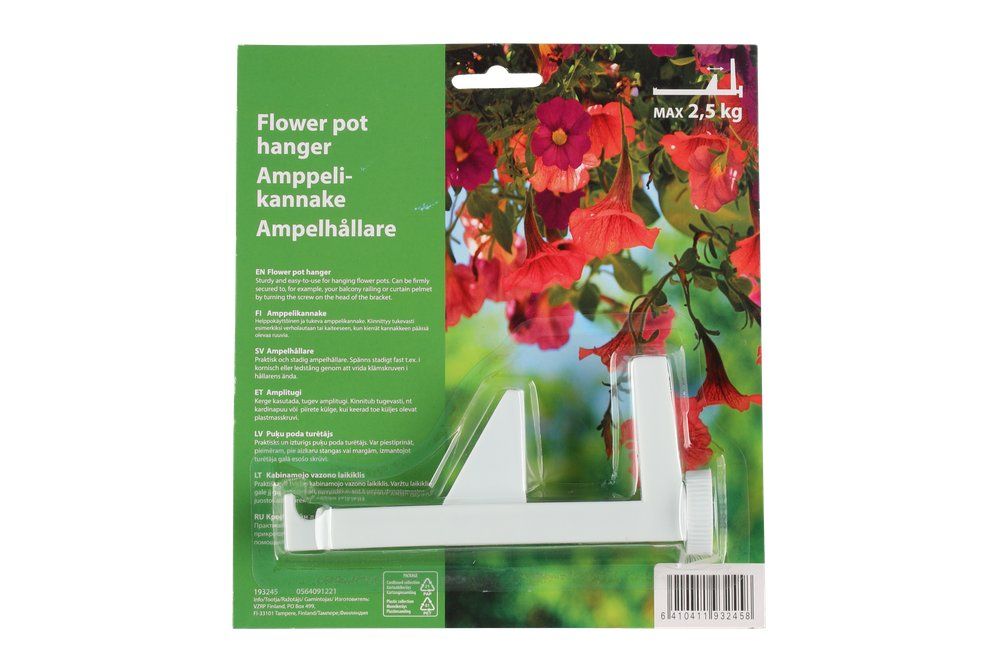 Helppokäyttöinen ja tukeva amppelikannake. Kiinnittyy tukevasti esim. verholautaan tai kaiteeseen kiertämällä kannakkeen päässä olevaa ruuvia. Maksimikuormitus 2,5 kg. Kokonaispituus 15 cm, max. kiinnitysleveys n. 4 cm.