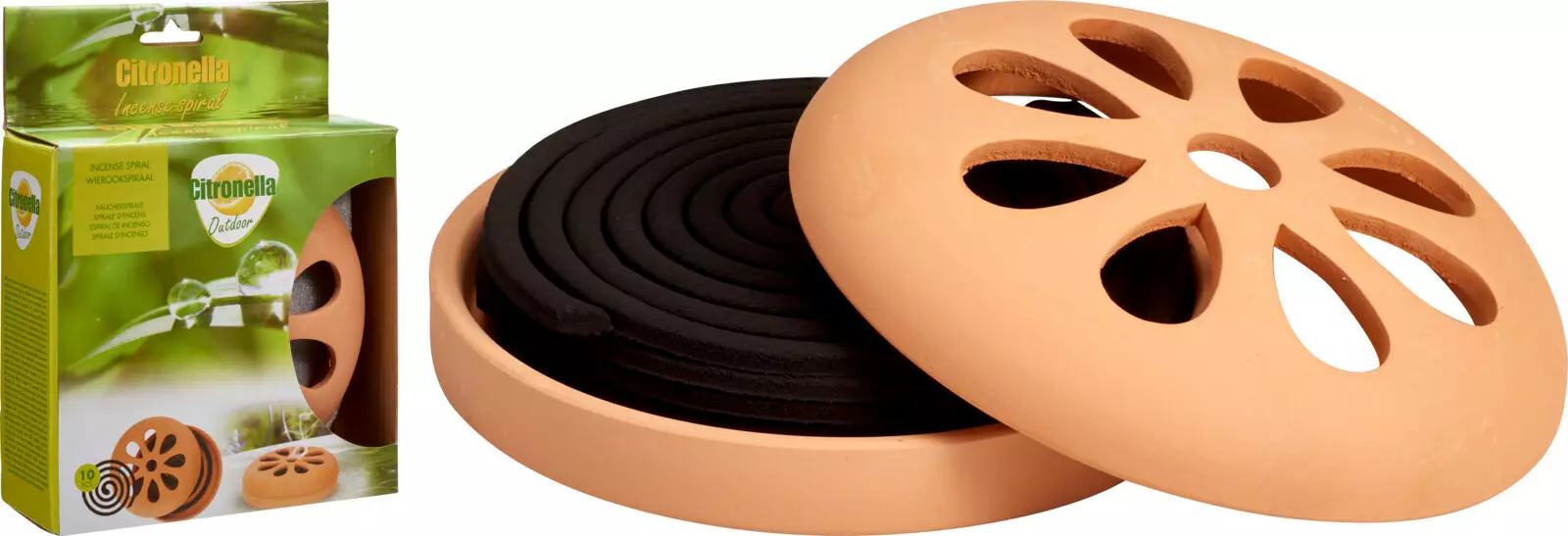 Tämä kauniisti muotoiltu terrakottapolttoalusta on täydellinen lisä hyttysenkarkoitukseen ja luo samalla rauhallisen tunnelman ympärillesi. Setti sisältää 5x2 hyttyssavuketta. Polttoalustan spiral-muotoilu takaa tasaisen palamisen ja tehokkaan hyttysten karkotuksen.