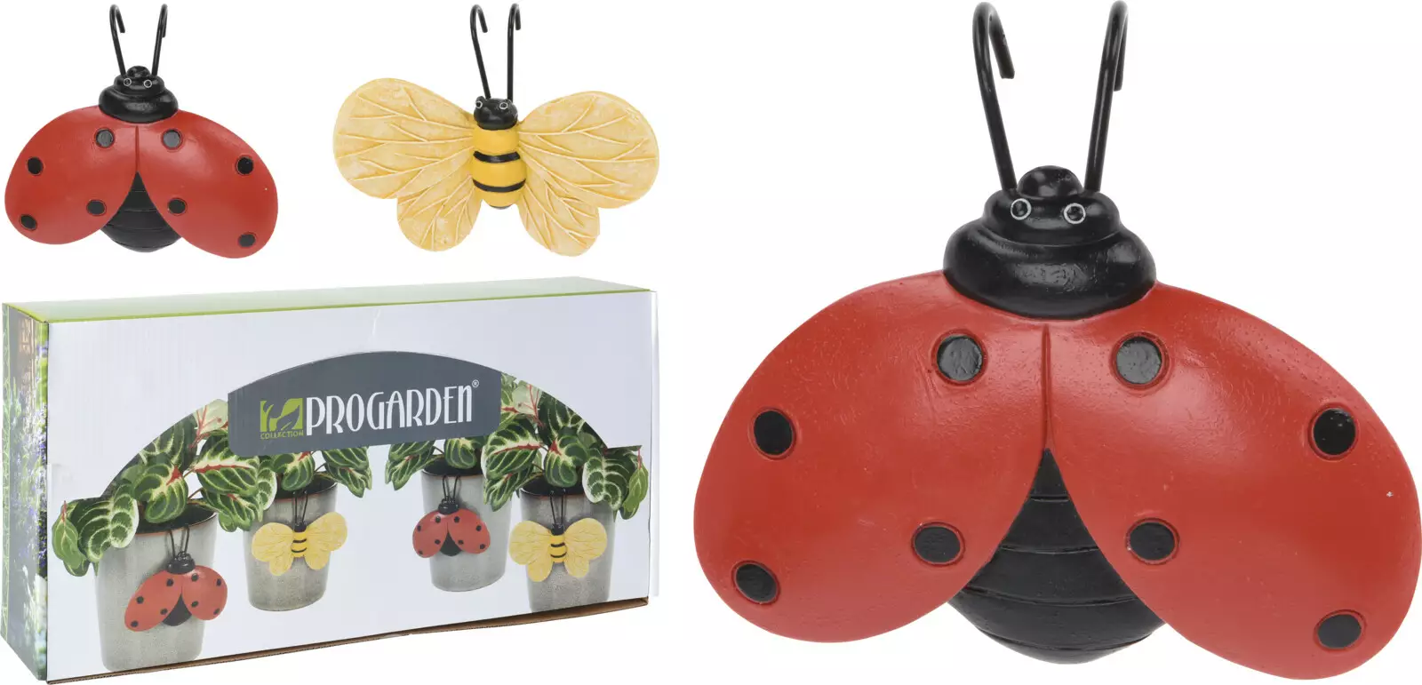 Suloinen kukkaruukun ja aidan koriste, jossa iloinen mehiläinen tai leppäkerttu. Polystone-materiaalista valmistettu ripustin kestää ulkokäyttöä ja metallinen koukku mahdollistaa helpon kiinnityksen.